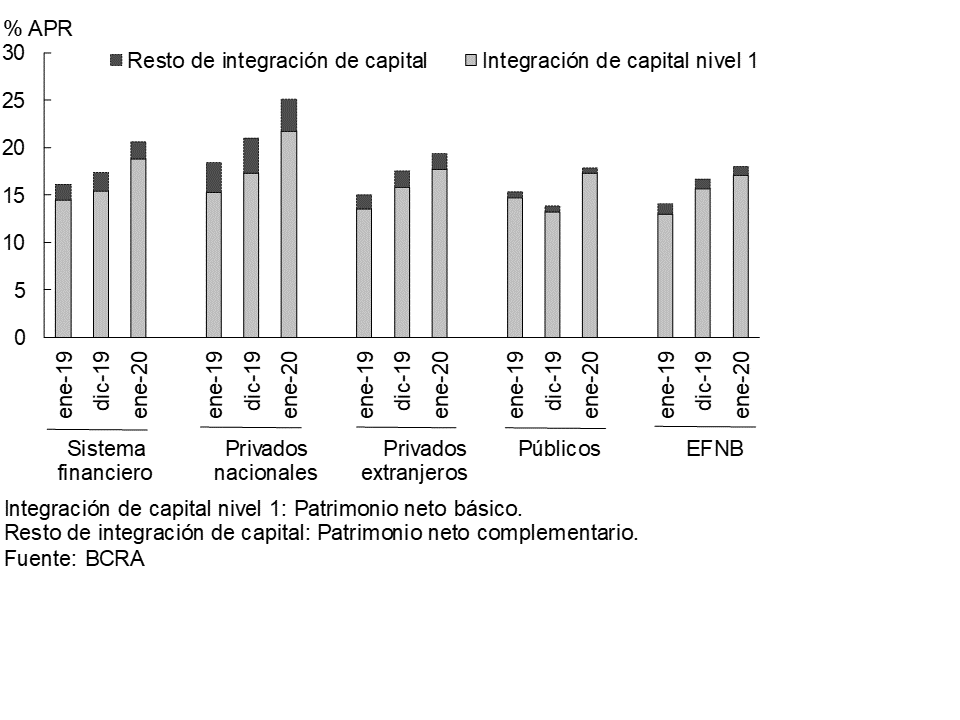 • A enero de 2020 la integración de capital —RPC— del conjunto de entidades financieras se ubicó en 20,7% de los activos ponderados por riesgo —APR—, 3,3 p.p. por encima del nivel registrado con información a diciembre 2019. En el marco de la entrada en vigencia de las nuevas disposiciones de registración contable, la RPC agregada del sistema financiero observó un aumento mayor al incremento de los APR, recogiendo fundamentalmente el efecto de la expresión de los activos no monetarios en moneda homogénea. Así, la posición de capital (RPC menos exigencia regulatoria) del sistema financiero alcanzó a 134% de la exigencia mínima de capital a enero de 2020.