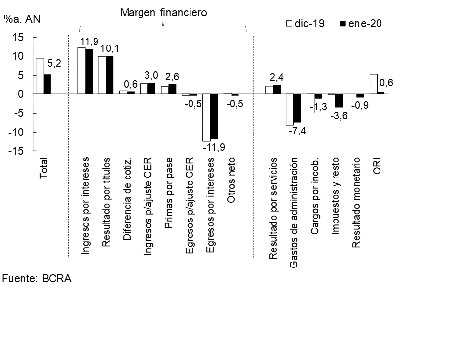 El margen financiero del conjunto de bancos alcanzó 15,4%a. del activo en enero, sin cambios significativos con respecto a diciembre (sólo +0,1 p.p.). Ligeros aumentos mensuales por primas por pases y por títulos valores conjuntamente con una disminución en los egresos por intereses (por depósitos) fueron prácticamente compensados por menores ingresos por intereses (por créditos), por una reducción de las ganancias por diferencias de cotización y una reversión de otros resultados financieros (mayormente debido a menores ganancias vinculadas a ajustes por operaciones a término de moneda extranjera). Considerando los distintos grupos de bancos, en enero el margen financiero se incrementó en los bancos públicos y se redujo en los privados.
