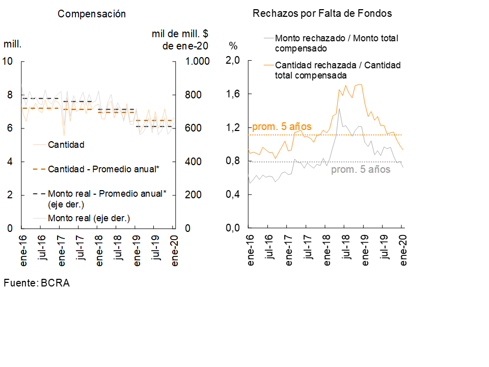 Considerando las operaciones cursadas a través del Sistema Nacional de Pagos, en enero disminuyó el promedio diario de transferencias inmediatas, en parte asociado a factores estacionales. Las operaciones promedio diarias en cantidades y en montos reales disminuyeron 13,7% y 8,7% con respecto a diciembre de 2019, respectivamente. Con relación al mismo mes del año anterior, las transferencias inmediatas registraron aumentos de 26,3% y 12,8% para cantidades y montos reales, respectivamente. Por su parte, en enero la compensación de cheques continuó reduciéndose, en línea con la tendencia de los últimos años (ver Gráfico 3). En el mes, la cantidad y el monto de rechazo por falta de fondos en términos del total compensado disminuyó respecto al mes anterior (0,93% en cantidades y 0,72% en montos, -0,05 p.p. y -0.07 p.p. con respecto a diciembre) y en una comparación interanual (-0,56 p.p. y -0,30 p.p., respectivamente). De este modo, el ratio de rechazo de cheques por falta de fondos se ubicó por debajo del nivel promedio de los últimos 5 años.