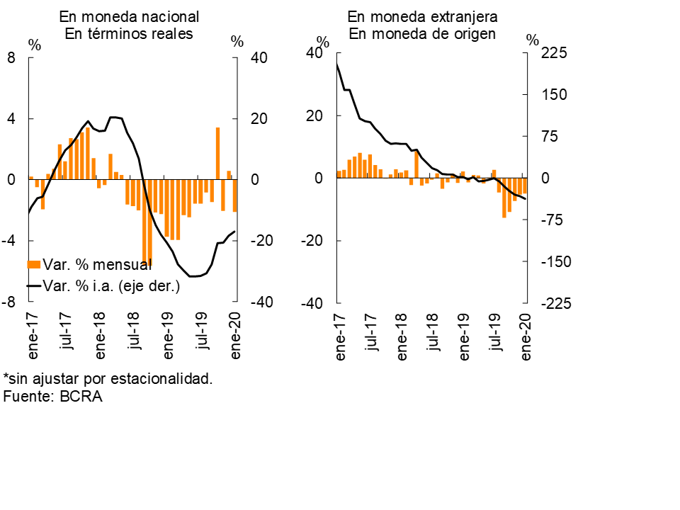 • El saldo de las financiaciones del sistema financiero al sector privado en pesos disminuyó 2,1% real en enero de 2020 (sin cambios significativos en términos nominales) y 5% en moneda extranjera —en moneda de origen—. La ponderación del crédito al sector privado en el activo total del sistema financiero se ubicó en 37,5%, reduciéndose 3,1 p.p. en comparación con el registro del año anterior.