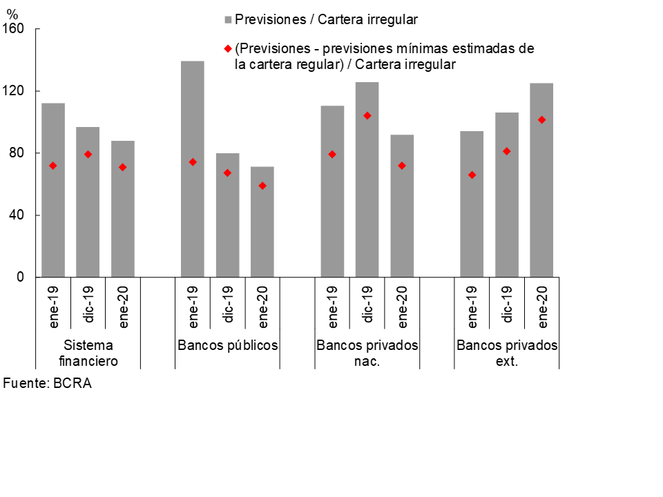• En el marco de los cambios adoptados en materia de deterioro de activos financieros, el saldo de previsiones contables totales representó 87,7% de los créditos al sector privado en situación irregular en enero. El saldo estimado de las previsiones atribuible a la cartera irregular (según los criterios vigentes en el texto ordenado de Previsiones Mínimas por Riesgo por Incobrabilidad) se ubicó en 70,9% de dicha cartera. Según esta estimación, las financiaciones en situación irregular no cubiertas con previsiones representaron sólo 5,4% de la RPC de enero de 2020.