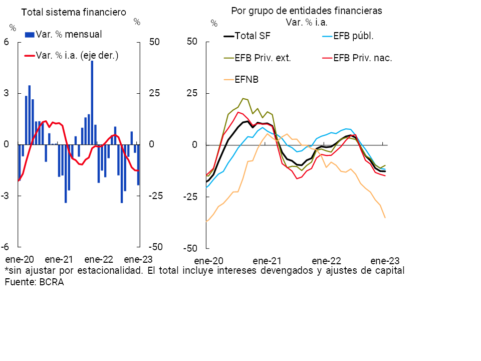 En enero el activo total del sistema financiero se redujo 1% en términos reales (+4,9% nominal), con disminuciones en todos los grupos de entidades financieras. En una comparación interanual, el activo total del sector acumuló un leve aumento en términos reales.