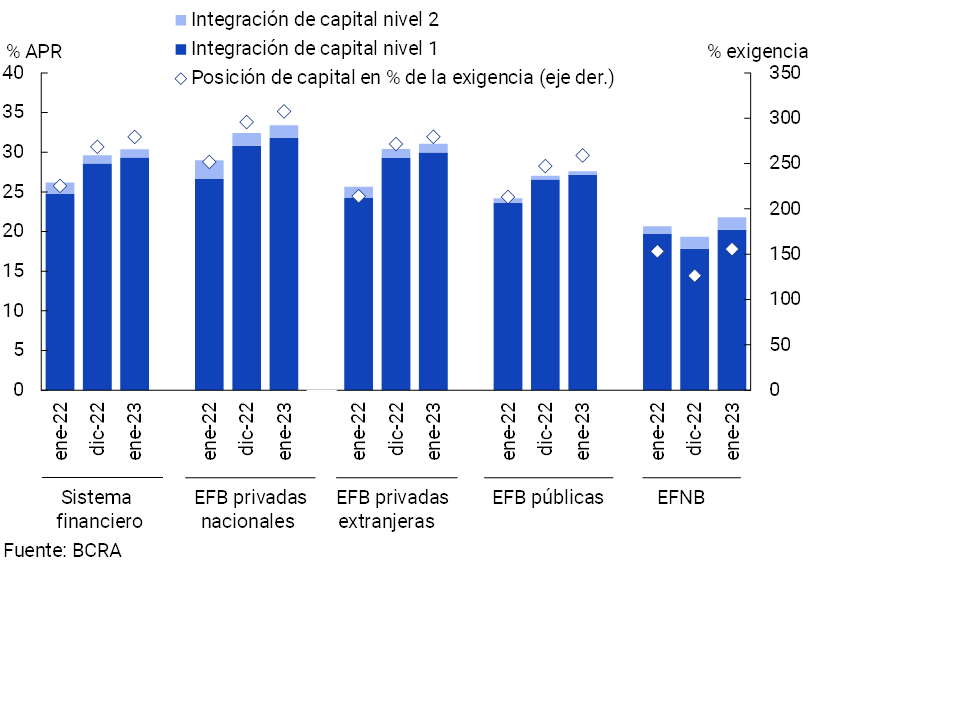 • En el comienzo del año aumentaron levemente los indicadores de solvencia del sistema financiero agregado. La integración de capital regulatorio (RPC) del conjunto de entidades financieras se ubicó en 30,4% de los activos ponderados por riesgo (APR) en enero, 0,7 p.p. por encima del registro del mes anterior (+4,2 p.p. i.a.). La posición de capital totalizó 279,5% de la exigencia a nivel sistémico, 11 p.p. más que en diciembre pasado (+54 p.p. i.a.).