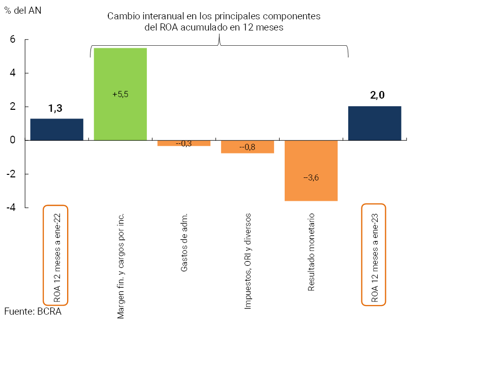 En lo que se refiere a la generación interna de capital del sector, en el comienzo del año el sistema financiero mantuvo indicadores positivos de rentabilidad. El resultado total integral en moneda homogénea del sistema financiero para el acumulado en los últimos 12 meses a enero fue equivalente a 2% del activo (ROA) y a 11,7% del patrimonio neto (ROE). Estos indicadores aumentaron en una comparación interanual (ver Gráfico 11) fundamentalmente por un mayor margen financiero. Este efecto fue parcialmente compensado por un incremento de las pérdidas por exposición a partidas monetarias, de las cargas impositivas y de los gastos de administración.