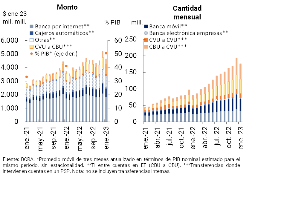 • En el inicio del año los medios de pago electrónico mantuvieron un destacado dinamismo interanual, si bien experimentaron cierta reducción en enero en el marco de factores estacionales. Las transferencias inmediatas (TI) aumentaron 118,8% i.a. y 26,6% i.a. en cantidades y en montos reales en enero, respectivamente. El uso de ECHEQs llegó a representar 34,3% de la cantidad de cheques compensados (+9,6 p.p. i.a.) y 59% de los montos (+9,5 p.p. i.a.) en el mes.