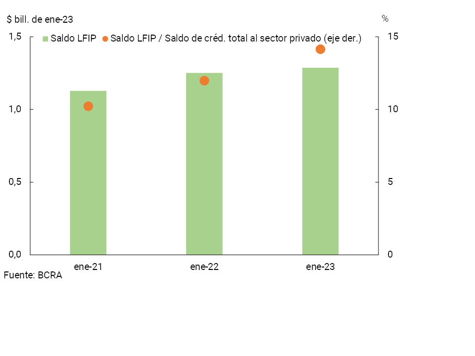 • El saldo de crédito en pesos al sector privado disminuyó 2,4% en términos reales en enero, desempeño influido por factores estacionales. Por su parte, el saldo estimado de Línea de financiamiento para la inversión productiva de MiPyMEs (LFIP) alcanzó $1,3 billones a principios de 2023, incrementándose 2,9% i.a. real. El saldo estimado de la LFIP representó 14,1% del saldo de crédito total al sector privado, 2,2 p.p. por encima del nivel de un año atrás y casi 4 p.p. respecto al registro de 2021. Recientemente el BCRA prorrogó la LFIP hasta el 30 de septiembre de 2023.