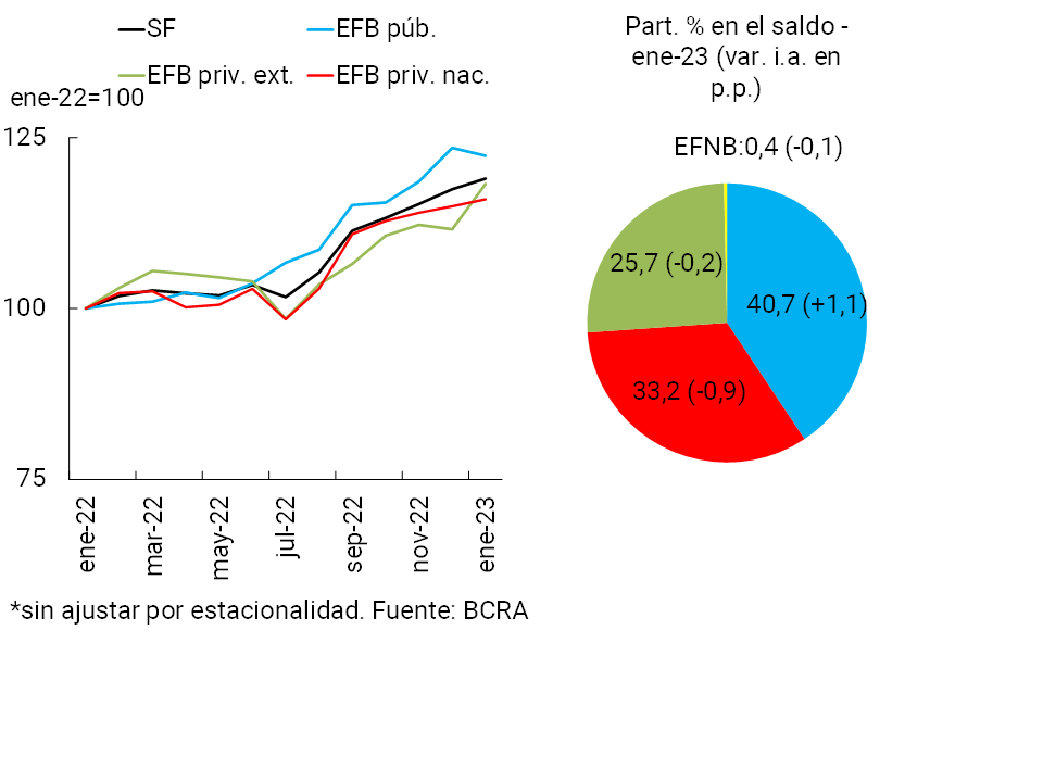 En parte influido por factores estacionales, en el comienzo de 2023 se redujo la actividad de intermediación financiera del conjunto de entidades con el sector privado. De acuerdo con los principales movimientos del balance agregado del sistema financiero para las partidas en pesos —en moneda homogénea—, en enero disminuyó el financiamiento al sector privado y al sector público, así como la liquidez en sentido amplio. Como contrapartida, se verificó una disminución del saldo de los depósitos —en moneda homogénea—. Por su parte, considerando las partidas en moneda extranjera, en el mes los incrementos de los depósitos del sector público y de las financiaciones —del sector privado y público—, resultaron las principales variaciones asimilables a orígenes y usos de fondos de las entidades, respectivamente.