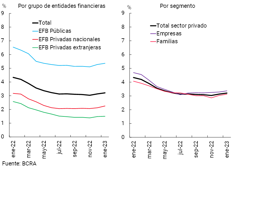 En el primer mes del año el ratio de irregularidad del crédito al sector privado se ubicó en 3,2%, siendo ligeramente superior al registro del cierre de 2022 aunque 1,1 p.p. menor en una comparación interanual. Estos desempeños del indicador —mensual e interanual— fueron generalizados en los grupos de entidades financieras bancarias y en los segmentos de crédito (ver Gráfico 7). El ratio de irregularidad del financiamiento a las familias se ubicó en 3,1% en enero (-0,9 p.p. i.a.). El indicador de morosidad del crédito a las empresas totalizó 3,4% en el período (-1,3 p.p. i.a.).
