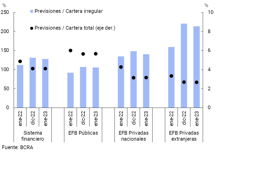 • En el primer mes del año el ratio de irregularidad del crédito al sector privado se ubicó en 3,2%, siendo ligeramente superior al registro del cierre de 2022, aunque 1,1 p.p. menor en una compa-ración interanual. Estos desempeños del indicador —mensual e interanual— fueron generalizados en los grupos de entidades financieras bancarias y en los segmentos de crédito —a familias y a empresas—. En el comienzo de 2023 las entidades financieras en conjunto mantuvieron un holgado nivel de previsionamiento, equivalente a 4,1% del saldo de crédito total al sector privado y a 127,9% del financiamiento al sector privado en situación irregular.