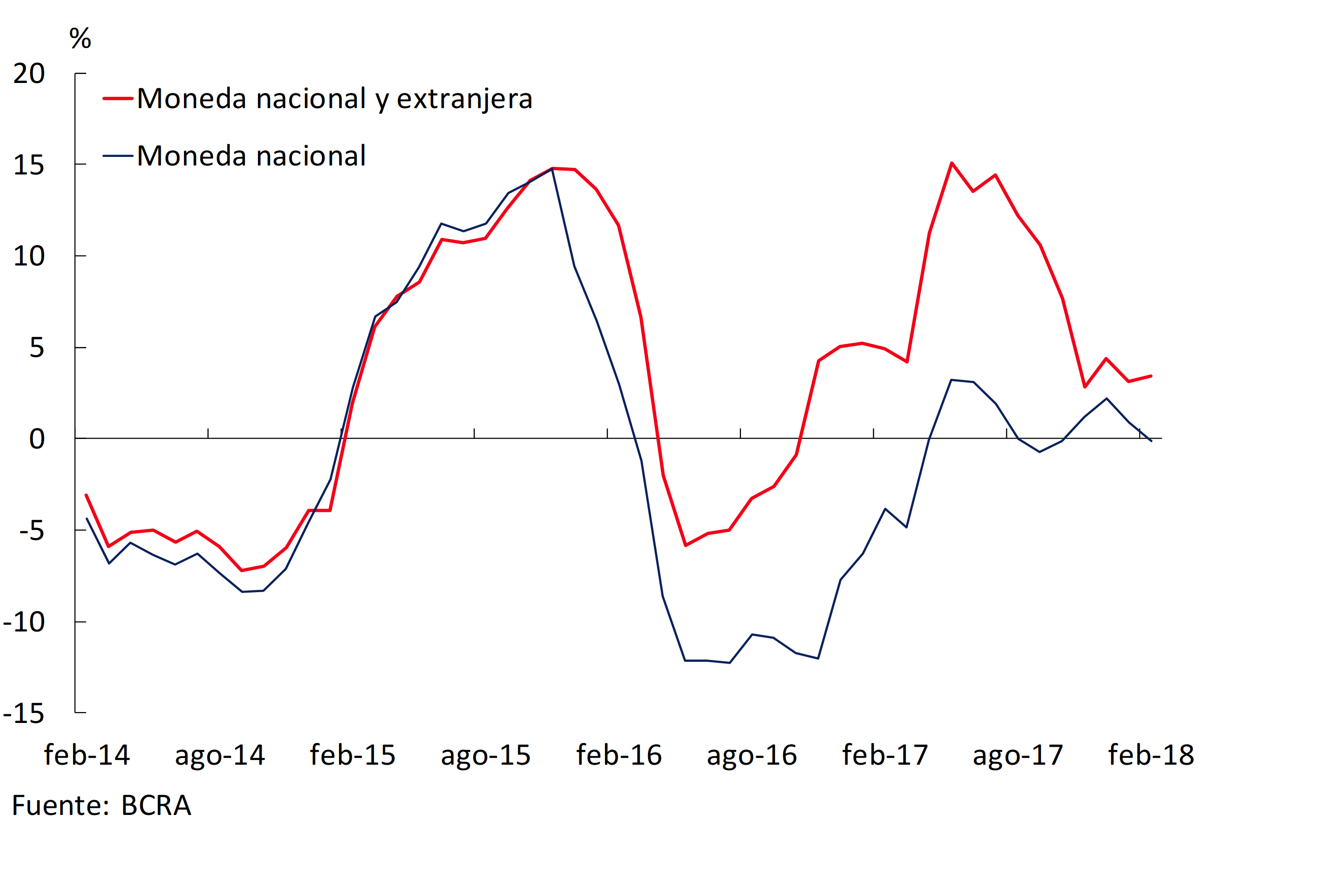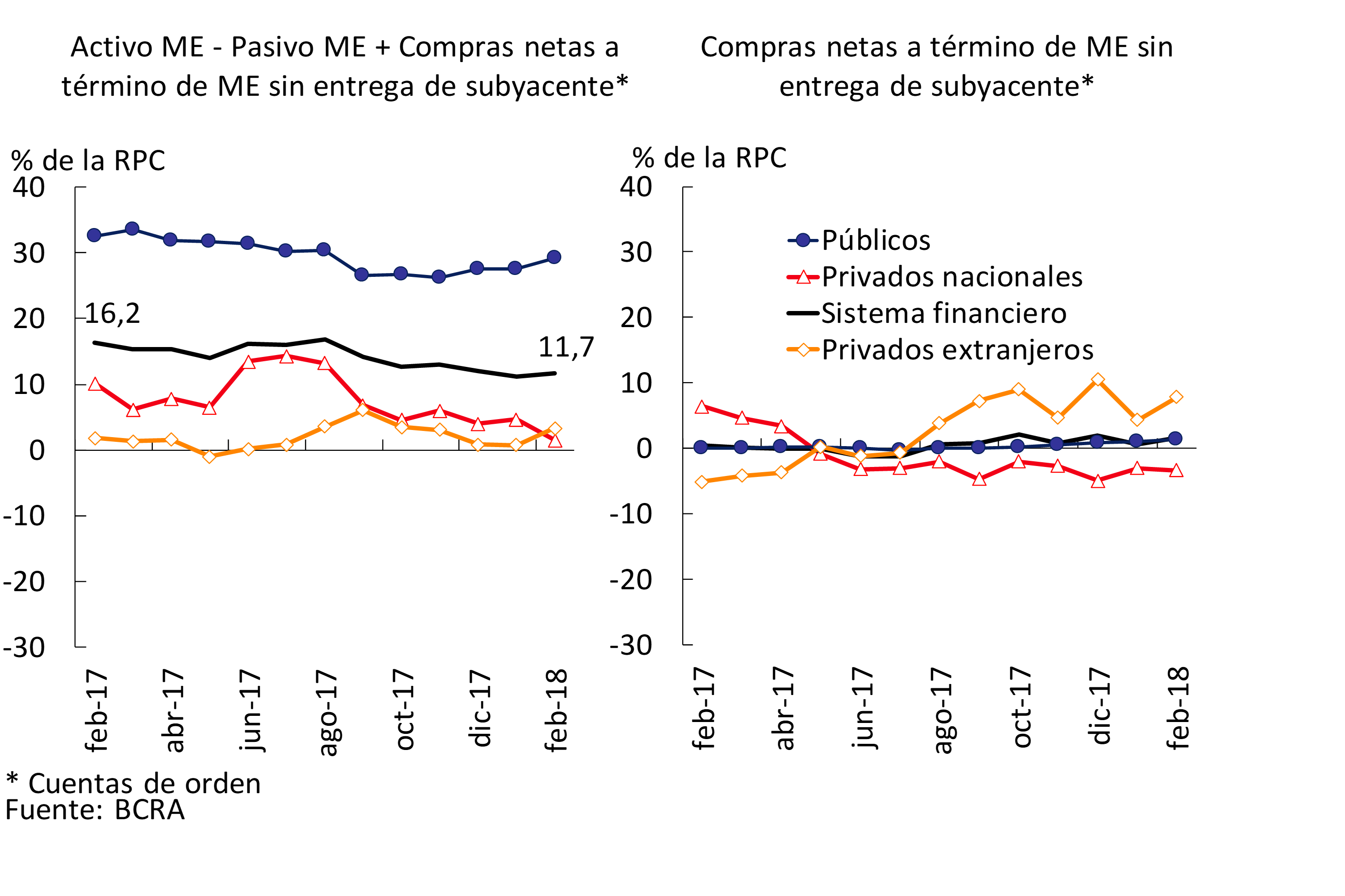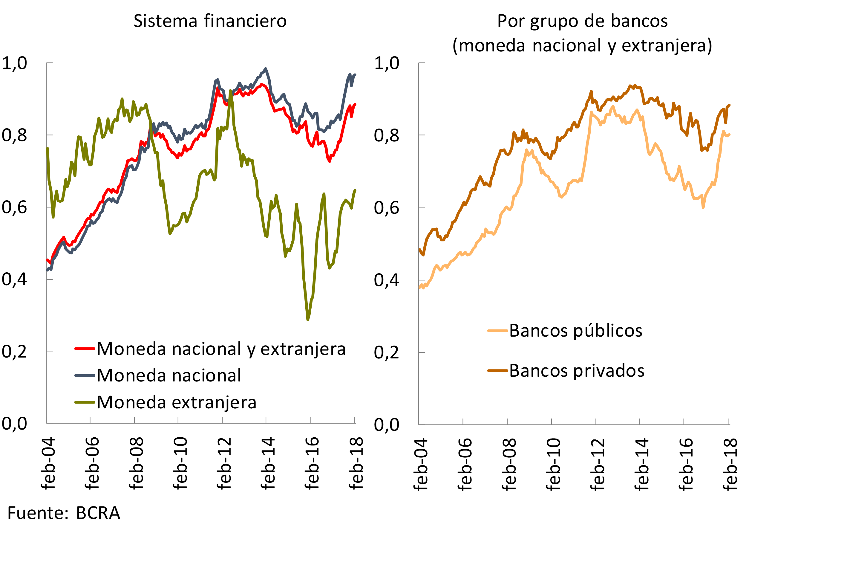 • En el mes el indicador amplio de liquidez del sistema financiero —considerando partidas en moneda nacional y extranjera, incluyendo la cuenta corriente de los bancos en el BCRA, las disponibilidades, los pases con el BCRA, LEBAC y LELIQ— totalizó 45,5% de los depósitos, permaneciendo sin cambios significativos respecto a enero (cayendo 5,3 p.p. con respecto a febrero de 2017). No obstante, se registró un aumento de la liquidez amplia en pesos del conjunto de las entidades financieras en el mes hasta alcanzar 43,4% que estuvo impulsado mayormente por las entidades públicas, aunque este indicador también se incrementó en el grupo de bancos privados. A nivel agregado, dicho crecimiento se explicó casi en su totalidad por el aumento de las tenencias de LELIQ. La liquidez en sentido más estricto —considerando sólo las disponibilidades y el saldo de las cuentas corrientes que los bancos tienen en el BCRA— se redujo 2 p.p. de los depósitos en el segundo mes del año hasta alcanzar 24,3%.