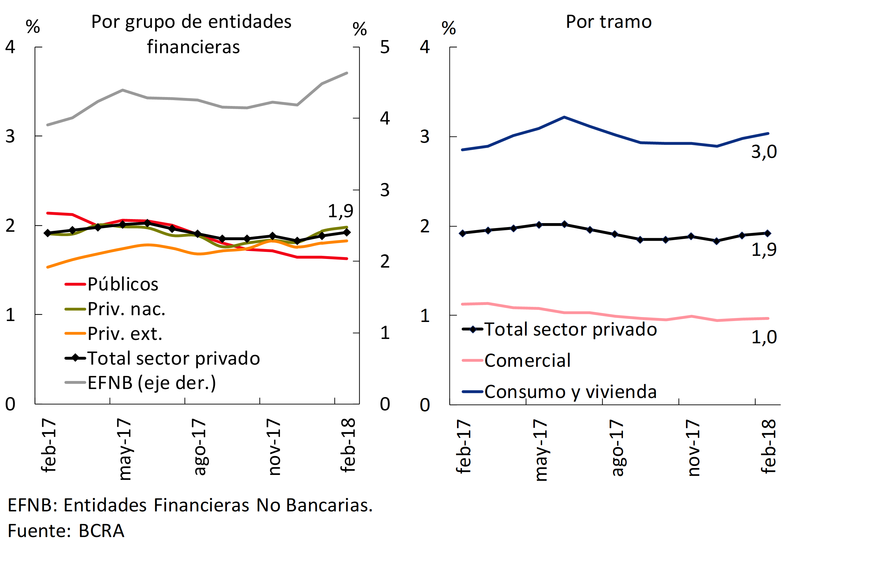 En febrero los cargos por incobrabilidad totalizaron 1%a. del activo, cayendo levemente con respecto a enero. Entre marzo de 2017 y febrero de 2018 los cargos por incobrabilidad del sistema financiero representaron 1,1% del activo, 0,2 p.p. más en una comparación interanual.