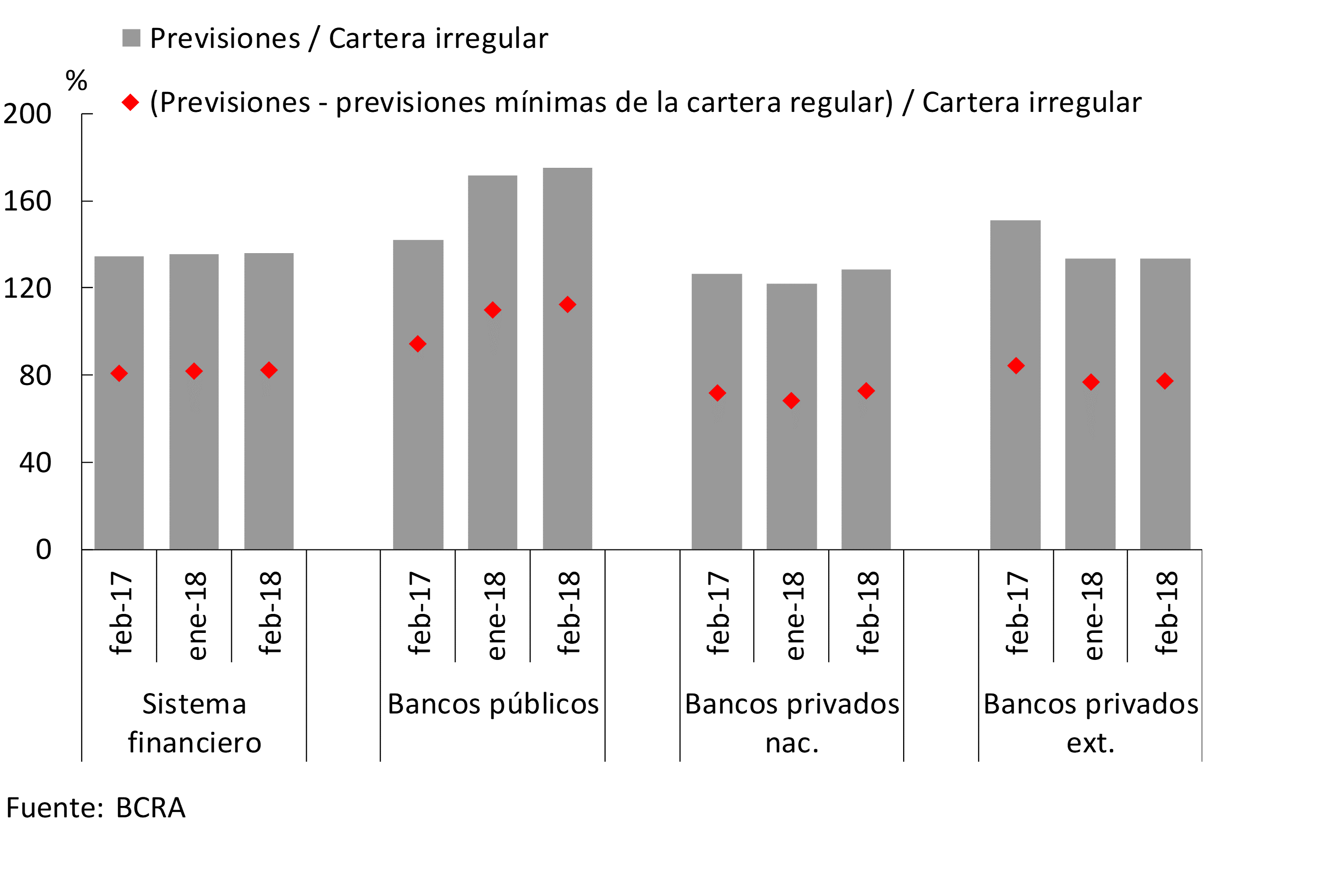 • En febrero el ratio de irregularidad del crédito al sector privado se ubicó en 1,9%, en línea con el nivel de un año atrás. Considerando la distribución del ratio de irregularidad entre las entidades financieras, en el comienzo de 2018 se observó una menor dispersión en relación a la evidenciada hace 12 meses. En el período, el saldo de previsiones contables del conjunto de bancos alcanzó un importe equivalente a 136% de los créditos en situación irregular.