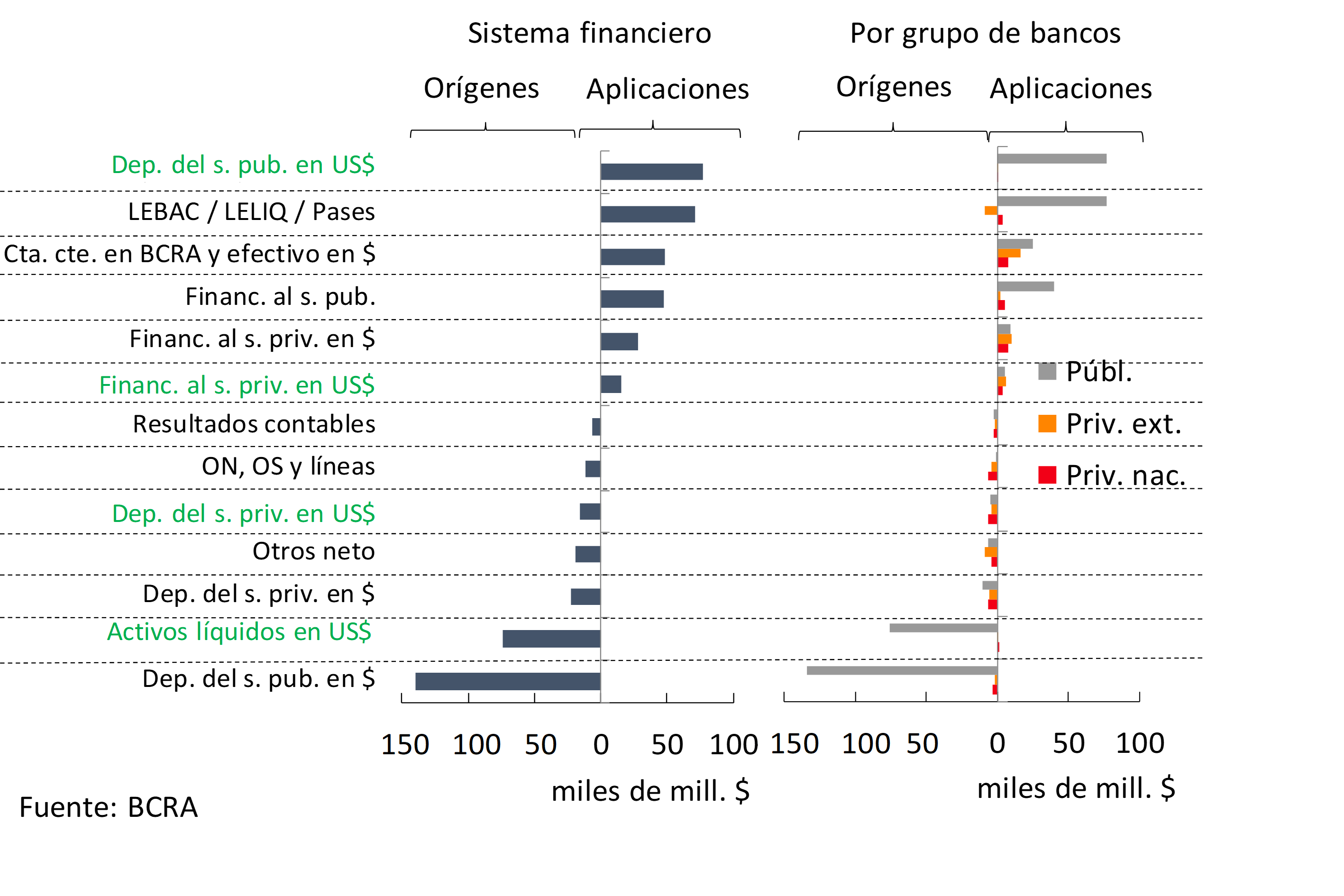 Teniendo en cuenta el segmento en moneda extranjera, en el mes la reducción de los activos líquidos fue la principal fuente de recursos del sistema financiero (equivalente a $73.600 millones). En menor medida, el incremento de los depósitos del sector privado en moneda extranjera también fue un origen de fondos en el mes. Tales recursos tuvieron como contrapartida la disminución de los depósitos del sector público en esta denominación (unos $77.400 millones) y el aumento del crédito al sector privado en dólares.