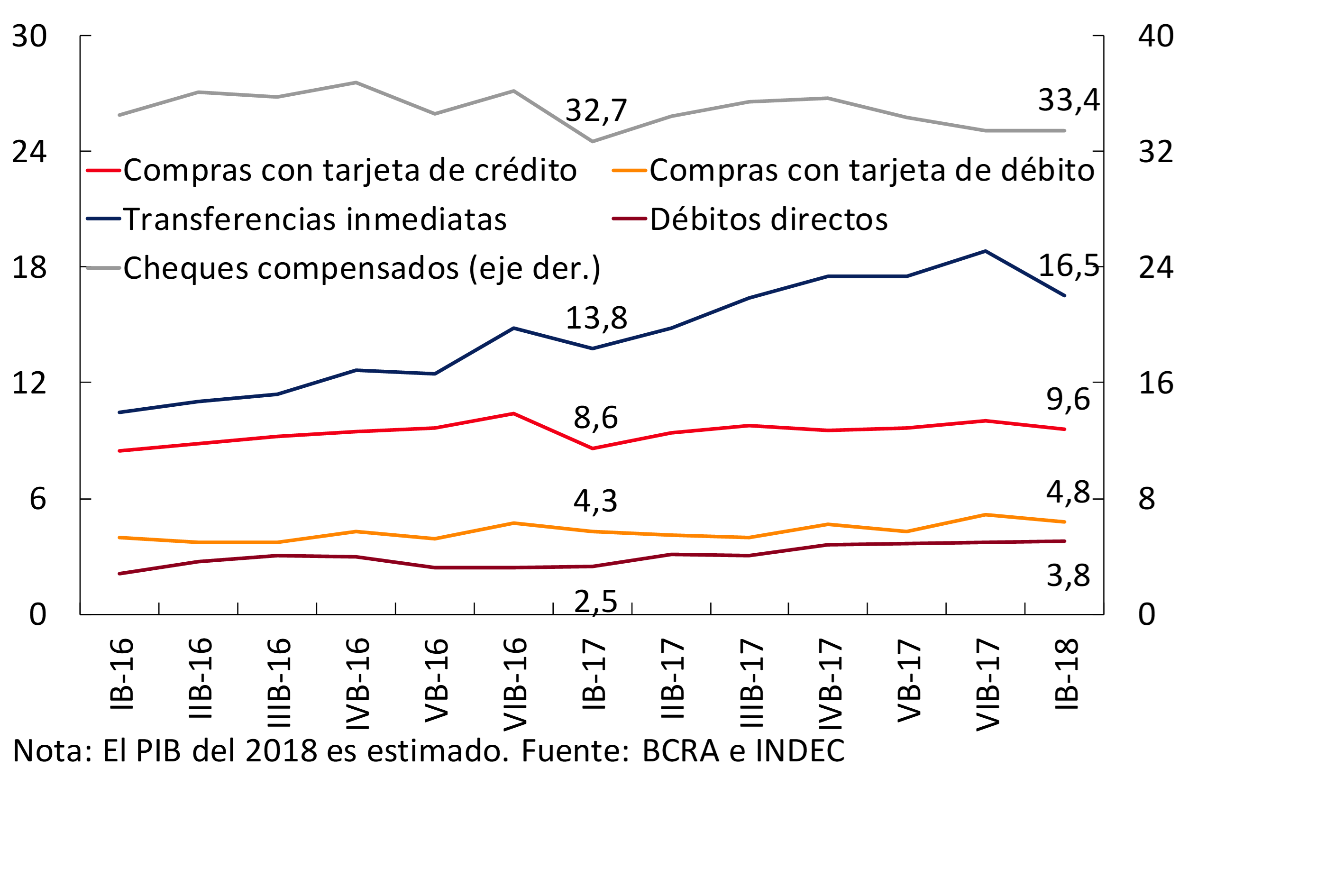 Gradualmente sigue profundizándose la utilización de medios de pago electrónicos en la economía. Más allá de un desempeño en el que predomina un componente estacional —fundamentalmente en el canal de Banca electrónica de empresas— durante el primer bimestre del año, se estima que las transferencias inmediatas crecieron 2,7 p.p. del PIB en una comparación interanual (ver Gráfico 3). Los débitos directos también incrementaron su relevancia interanualmente (+1,3 p.p. del PIB). Por su parte, el aumento interanual en el volumen de cheques compensados resultó más moderado.