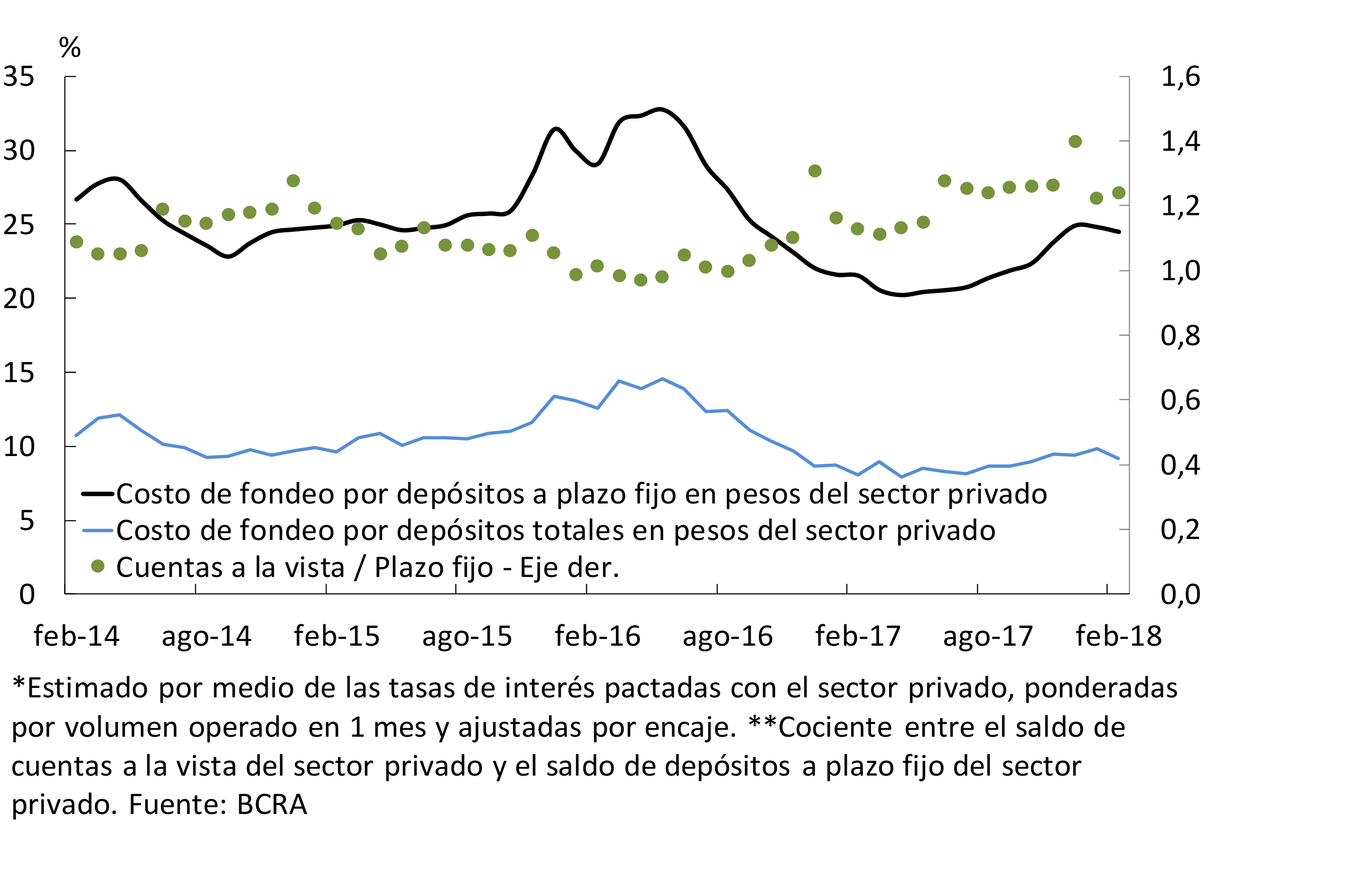 El costo de fondeo por depósitos a plazo en pesos del sector privado se redujo levemente en febrero y con respecto a fines de 2017 (ver Gráfico 7). Esta reducción se da en el marco de una caída en la tasa de interés promedio operada por depósitos en pesos a plazo fijo (-0,3 p.p. con respecto a diciembre de 2017). Dicho cambio se produjo en el contexto de la reducción en los niveles de tasas de política monetaria (-0,8 p.p. respecto a enero y -1,5 p.p. en el primer bimestre del año). Además, la mayor ponderación de las cuentas a la vista en relación a las colocaciones a plazo en el período contribuyó a reducir el costo de fondeo total del sistema financiero agregado por depósitos en moneda nacional.