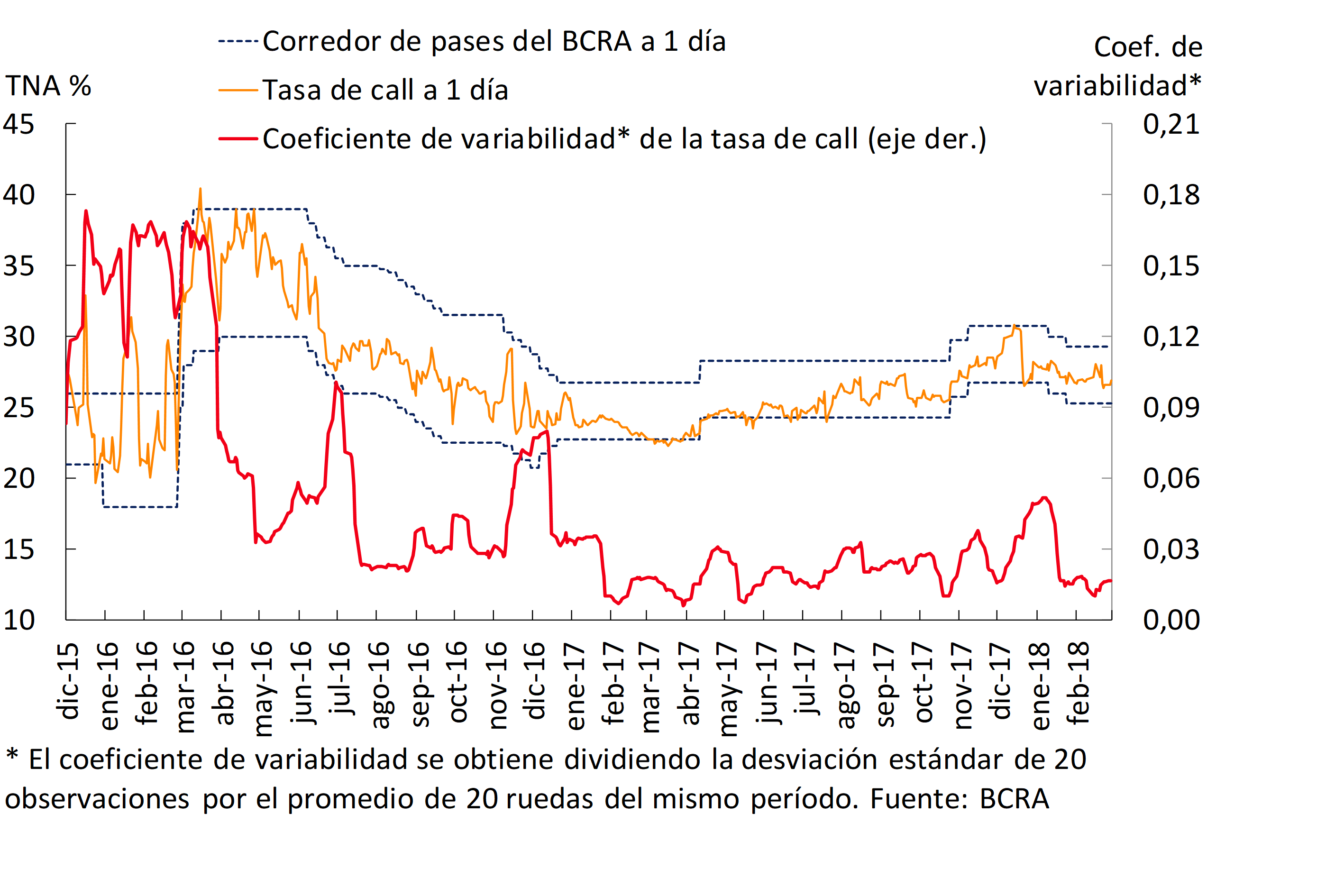 Las tasas de interés promedio por préstamos entre bancos sin garantía —call— se redujeron en el mes, ubicándose en la mayoría de las ruedas dentro del corredor de tasas establecido por el BCRA (ver Gráfico 8). El volumen promedio mensual operado en febrero en este mercado resultó 15,3% superior al de enero. En el mes se mantuvo una volatilidad acotada en la tasa de call.