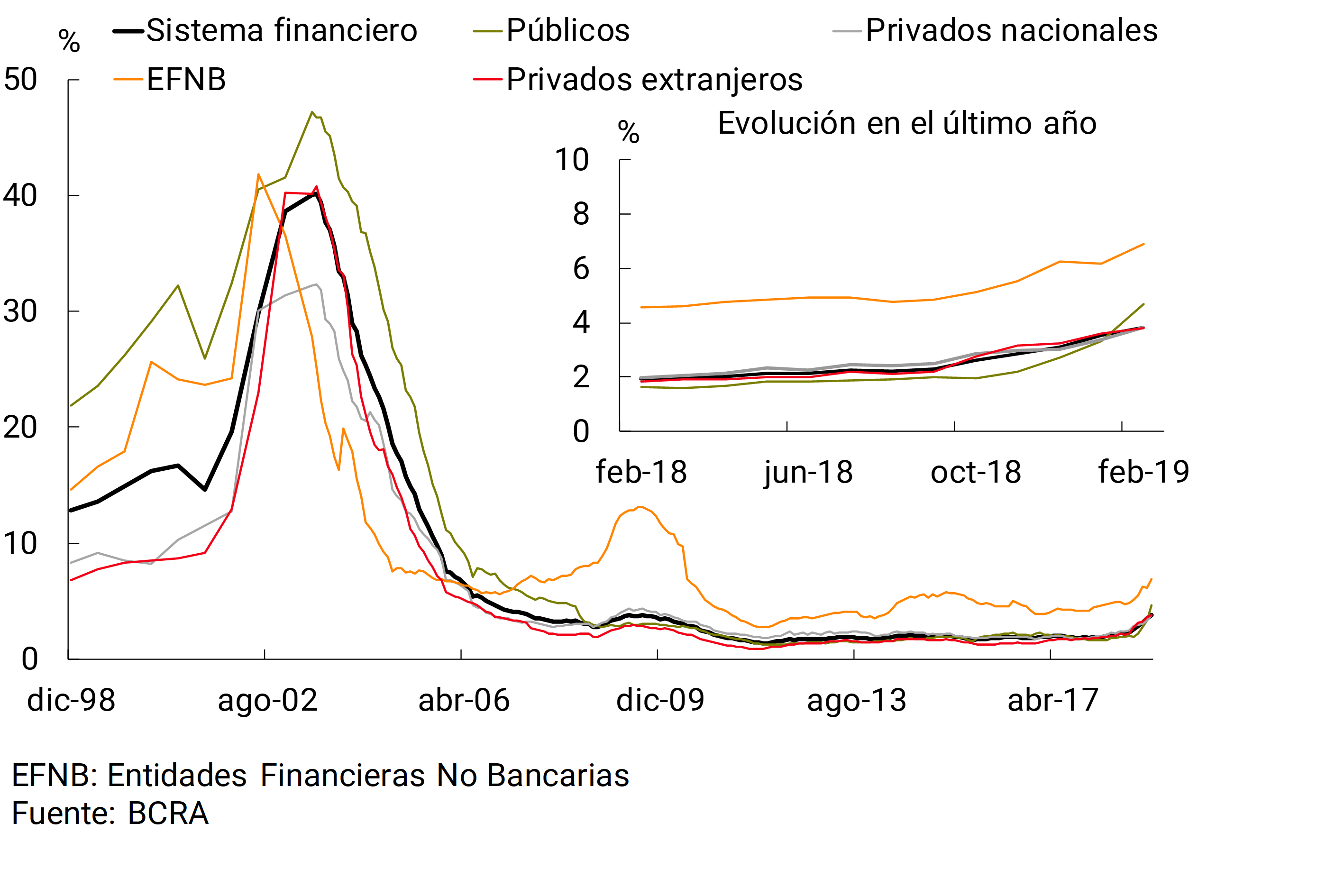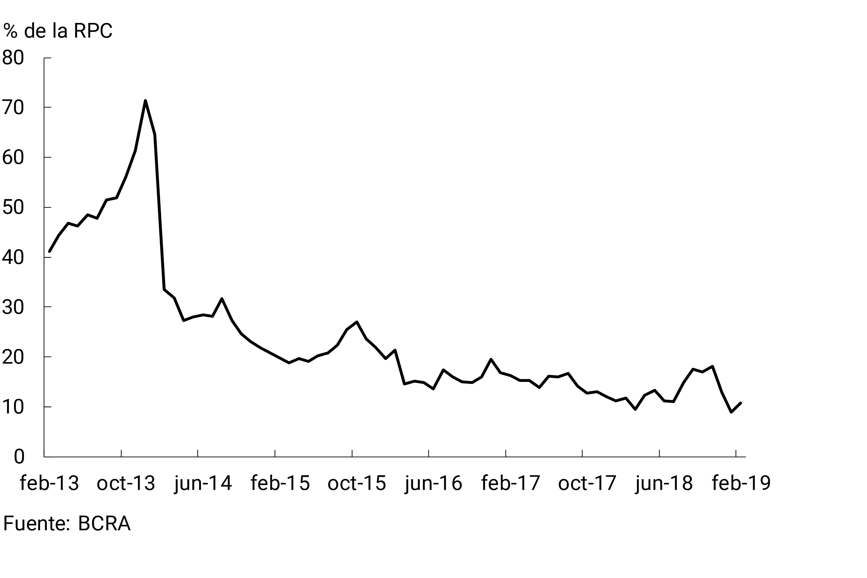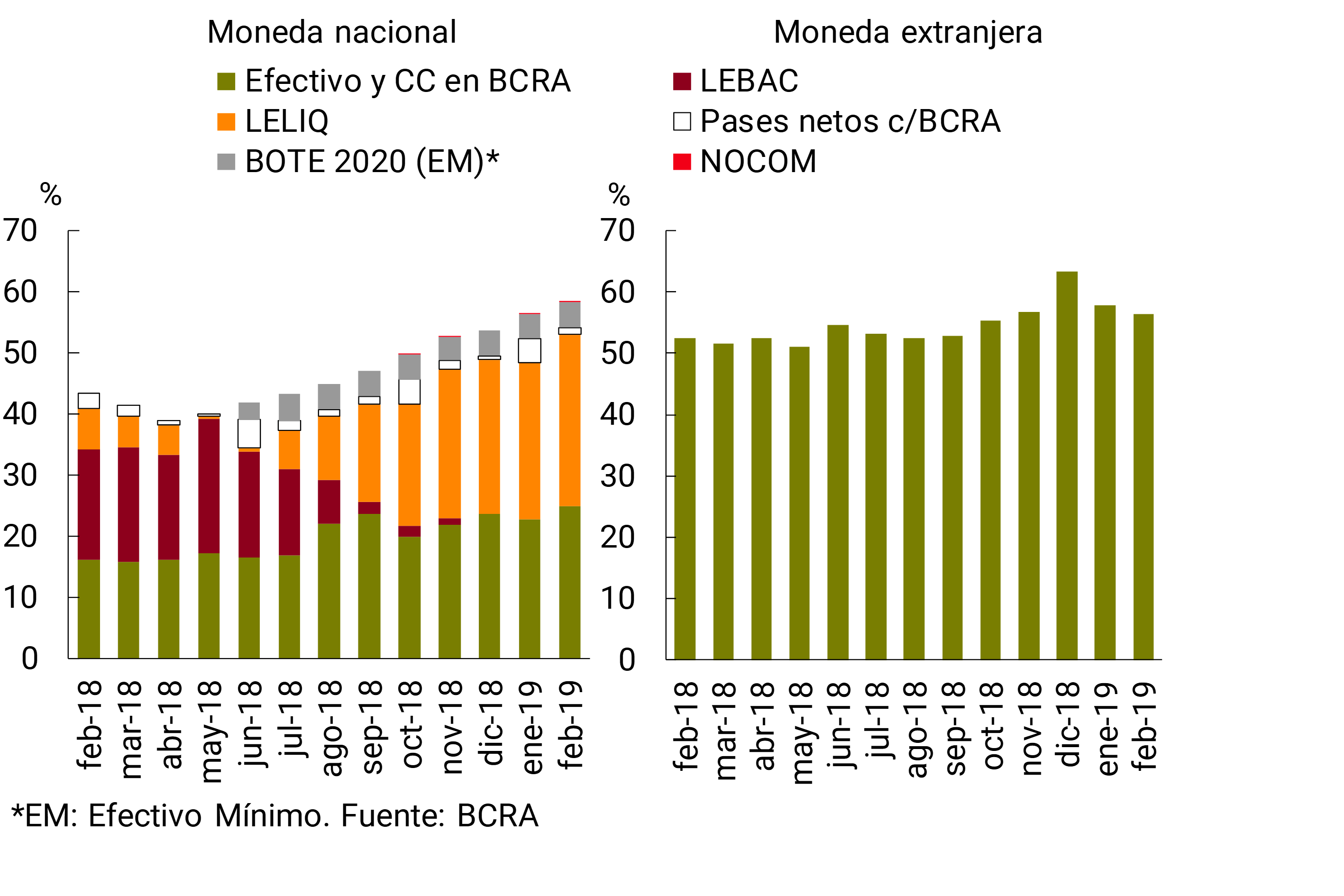 En los últimos 12 meses, los depósitos en pesos del sector privado cayeron 2,2% real, con un incremento en el saldo de las colocaciones a plazo (+16,3% i.a. real) y una reducción en el de las cuentas a la vista (-16,6% i.a. real). Los depósitos en moneda extranjera del sector privado se expandieron 15,7% respecto a febrero de 2018 en moneda de origen. El saldo de depósitos totales creció 2,3% real en una comparación interanual.