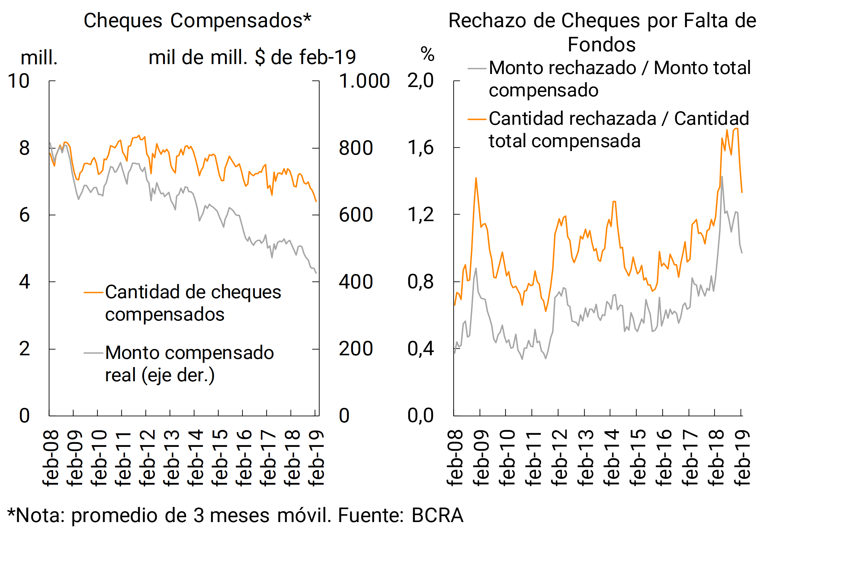 Considerando las operaciones del Sistema Nacional de Pagos, en el mes las transferencias inmediatas de fondos aumentaron en cantidad y se redujeron en valores reales. En relación con febrero de 2018 las transferencias inmediatas aumentaron, tanto en el número de operaciones (+76% i.a.) como en los montos cursados (+8,9% i.a. en términos reales). Por su parte, los cheques compensados continuaron reduciéndose en febrero tanto en cantidad como en montos —en términos reales—. El valor y la cantidad de cheques rechazados por falta de fondos en términos del total compensado cayó en el mes (ver Gráfico 3), retornando así a niveles similares a los del primer trimestre de 2018.