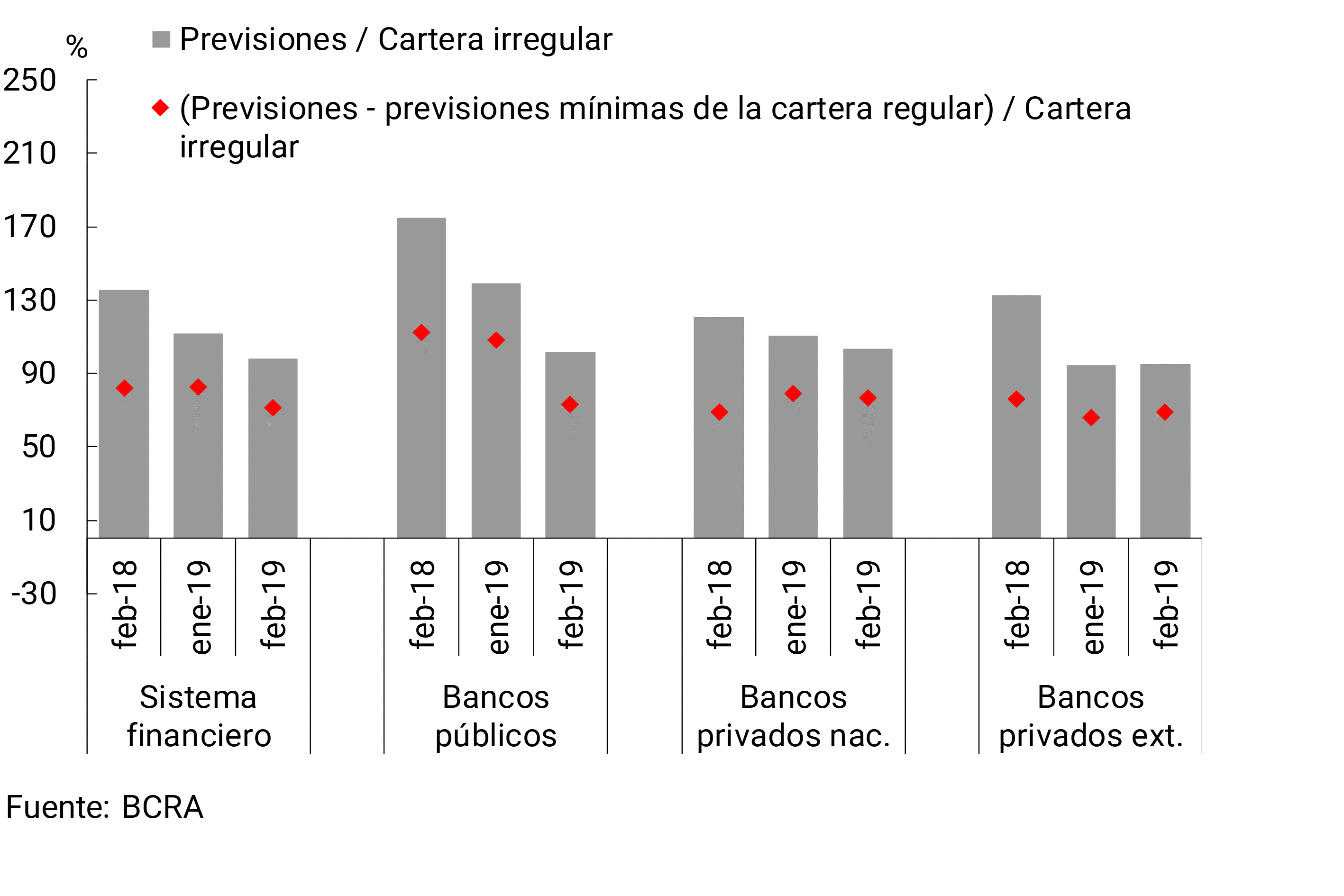 • El ratio de irregularidad de la cartera total de crédito al sector privado alcanzó 3,8% en febrero, 0,3 p.p. más que el mes pasado (+1,9 p.p. i.a.). El indicador de irregularidad de las financiaciones a las empresas se ubicó en 3,5% en febrero (incremento mensual de 0,4 p.p. e interanual de 2,5 p.p.), en tanto que el de las familias se situó en 4,4% (aumento de 0,2 p.p. en el mes y de 1,4 p.p. i.a.). La mora de los hipotecarios a los hogares se mantuvo en los mismos niveles de enero: 0,25% para el segmento UVA y 0,6% para los restantes. La cobertura de la cartera irregular con previsiones continuó en niveles elevados.