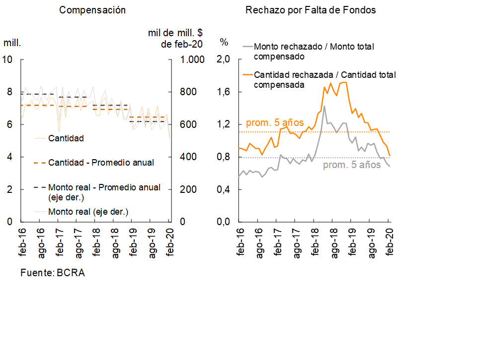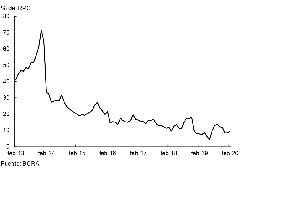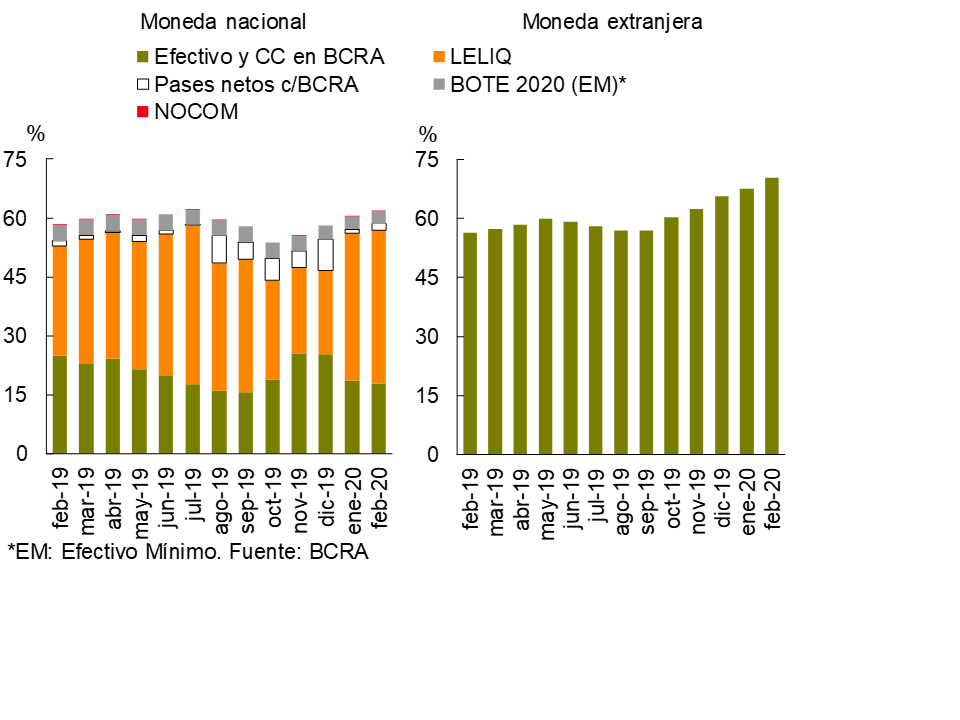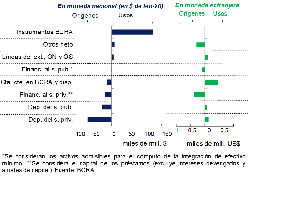 En comparación con febrero de 2019, el crédito en moneda nacional al sector privado acumuló una caída de 14,2% real, explicada principalmente por las líneas de crédito prendarias y personales. El financiamiento en moneda extranjera se redujo 38,7% i.a. —en moneda de origen—.
