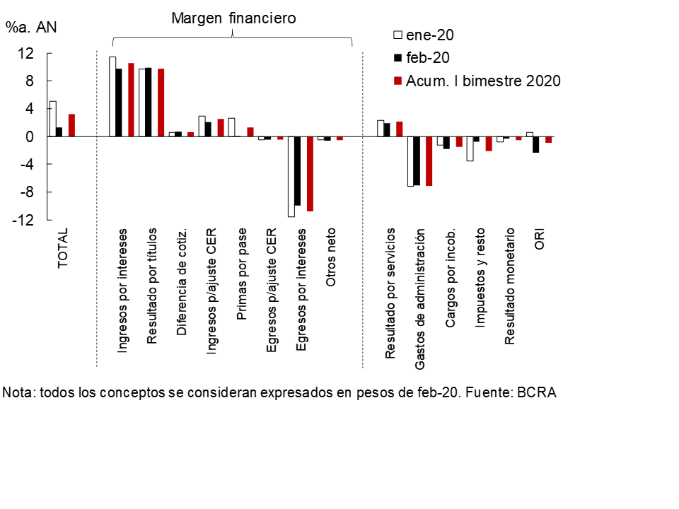 El conjunto de bancos devengó pérdidas en ORI equivalentes a 2,3%a. del activo en febrero, revirtiendo un resultado levemente positivo registrado en enero. La mayor parte del cambio mensual en este concepto estuvo explicada por resultados derivados de instrumentos financieros a valor de mercado, fundamentalmente en bancos públicos y privados extranjeros. En el primer bimestre de 2020, el ORI del sistema financiero fue negativo y equivalente a 1%a. del activo.