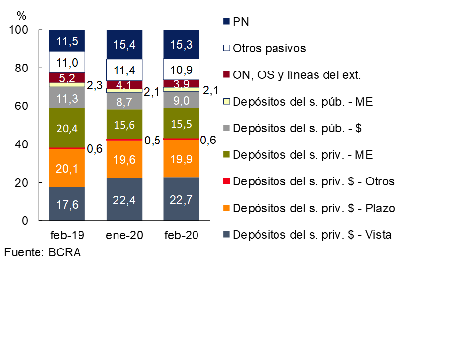 En este marco, la ponderación de los depósitos del sector privado en el fondeo total —pasivo total más patrimonio neto—aumentó 0,5 p.p. en febrero, hasta ubicarse en 58,7%(sin cambios en una comparación interanual, ver Gráfico 4).