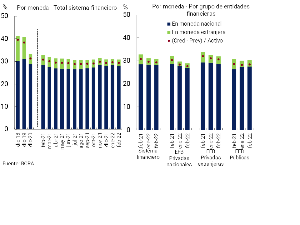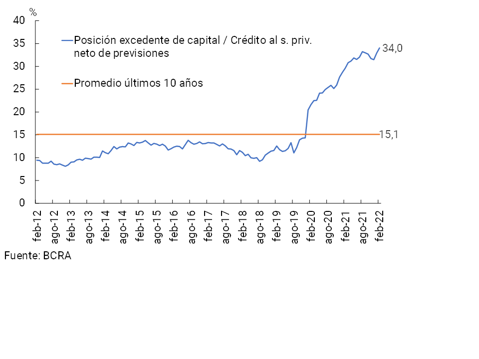 La relación entre la posición excedente de capital regulatorio y el crédito al sector privado neto de previsiones se ubicó en 34% para el sector en su conjunto en febrero (aumentando levemente en el mes y 4,4 p.p. i.a.), siendo un nivel muy superior al promedio de los últimos 10 años —15,1%—(ver Gráfico 16).