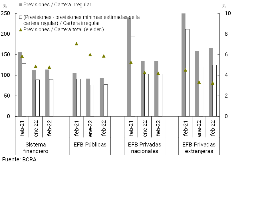 • En febrero el ratio de irregularidad del crédito al sector privado no presentó cambios de magnitud (-0,1 p.p.), ubicándose en 4,2% para el sistema financiero. El desempeño mensual fue similar en todos los grupos homogéneos de entidades financieras, y en los segmentos de préstamos a empresas y a familias. Por su parte, las previsiones constituidas representaron 4,8% del crédito total y 113,8% de la cartera en situación irregular.