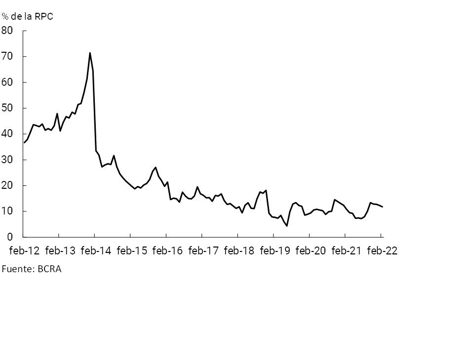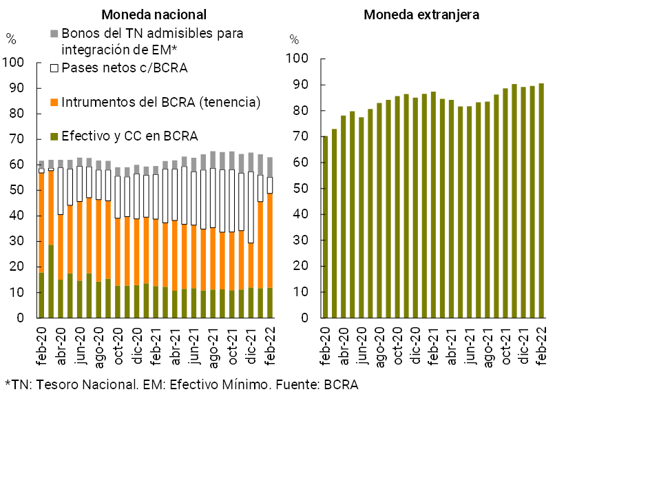 17En febrero comenzaron a licitarse las NOTALIQ, aunque su ponderación en términos de los depósitos aún es acotada. A su vez, a partir de febrero entró en vigencia una modificación de la franquicia sobre la exigencia de efectivo mínimo en pesos para las entidades que participan del Programa Ahora 12 (pasando del 50% a un 40% de las nuevas financiaciones canalizadas a través de este programa, ver Comunicación ““A” 7448”)