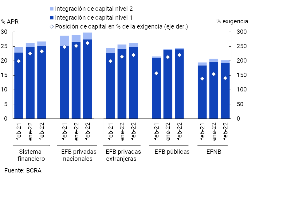 • En febrero aumentaron los indicadores de solvencia del sector. La integración de capital regulatorio (RPC) representó 26,7% de los activos ponderados por riesgo (APR) para el agregado de entidades financieras (+0,5 p.p. en el mes y +2 p.p. i.a.), en tanto que la posición de capital (RPC menos exigencia normativa) totalizó 232,8% de la exigencia mínima en el período (+7,4 p.p. con respecto a enero y +33,7 p.p. i.a.) a nivel sistémico. La posición de capital regulatorio representó 34% del crédito al sector privado neto de previsiones, muy por encima del promedio de los últimos 10 años.