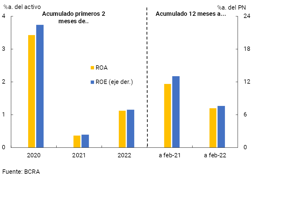 • En el acumulado de 12 meses a febrero, el conjunto de entidades registró un resultado total integral en moneda homogénea positivo equivalente a 1,2% del activo (ROA) y a 7,6% del patrimonio neto (ROE). Estos niveles resultaron inferiores en una comparación interanual.