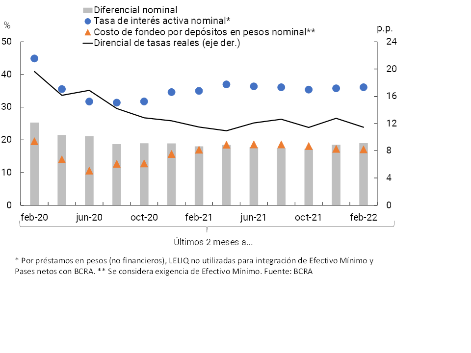 19Tomando tasas de interés implícitas nominales que surgen de los principales activos y pasivos en moneda nacional. Para el cálculo de las tasas de interés implícitas no se toman en cuenta conceptos tales como gastos de administración, egresos impositivos, costo de capital ni otros componentes asociados a cobertura por riesgos intrínsecos a la operatoria de intermediación financiera. En esta estimación las tasas de interés implícitas se construyen acumulando los flujos los últimos 2 meses y se anualizan