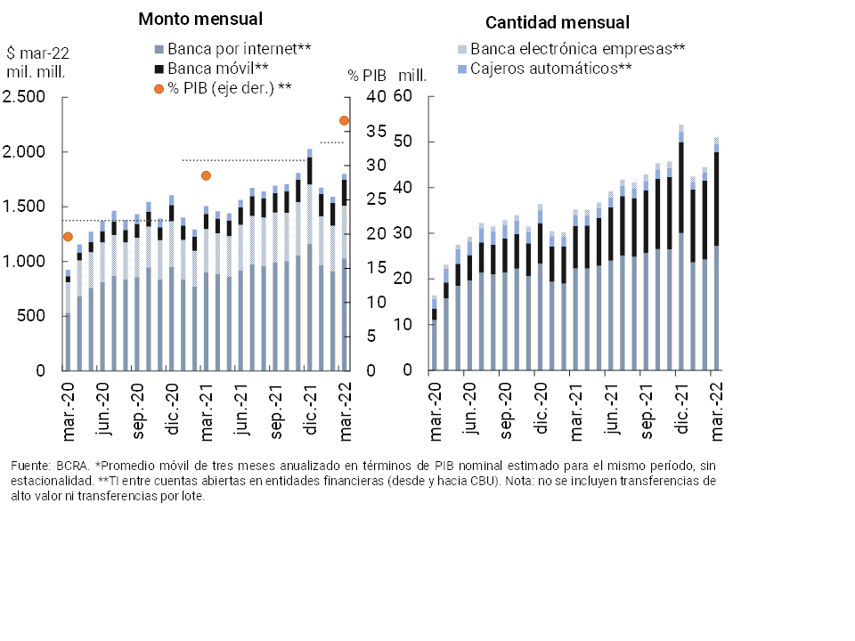 • En marzo (última información disponible) aumentaron las transferencias inmediatas de fondos (TI) entre cuentas con CBU y la compensación de cheques electrónicos (ECHEQs). Respecto a las operaciones en el marco del esquema de Transferencias 3.0, desde el inicio del esquema pleno de interoperabilidad de los pagos con QR —fines de noviembre de 2021— y hasta marzo del corriente, la cantidad de operaciones acumuladas por medio de esta modalidad alcanzó 6 millones (equivalente a un total de $10.327 millones, con un promedio de $1.725 por transacción).