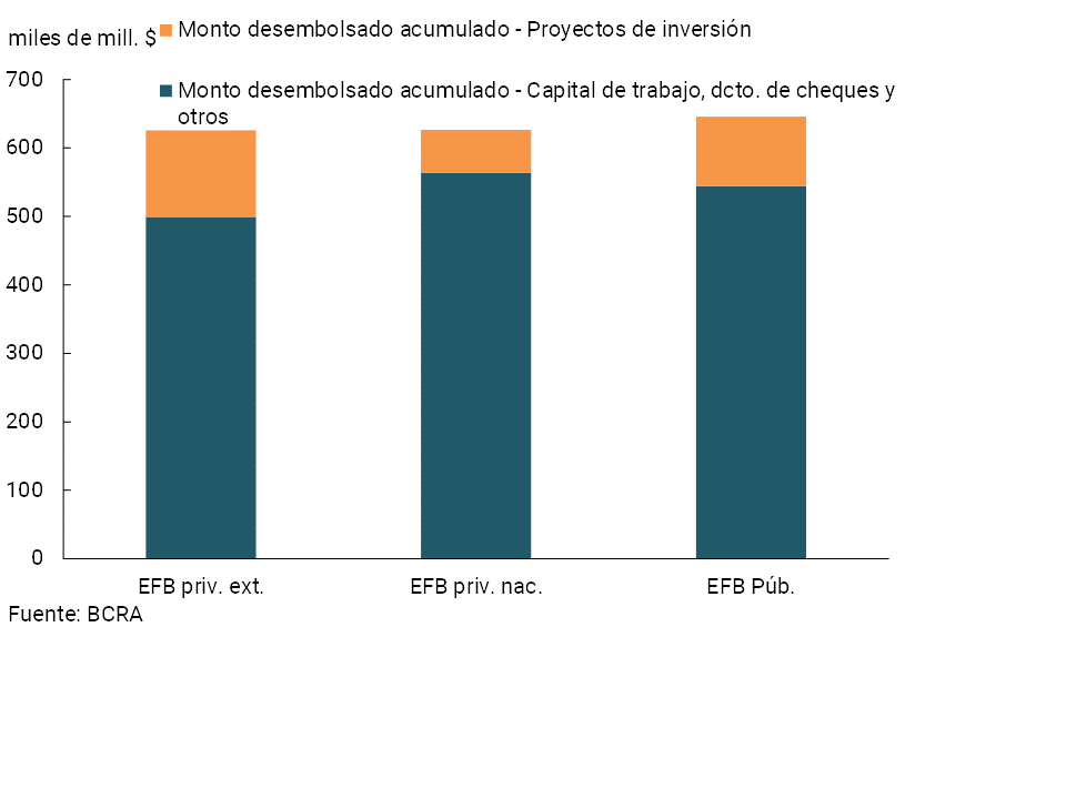• El saldo financiamiento al sector privado en pesos expresado en término reales disminuyó 1,5% (+3,1% nominal) en febrero, manteniéndose sin cambios de magnitud en comparación con el nivel observado un año atrás. La Línea de Financiamiento para la Inversión Productiva (LFIP) de MiPyMEs continuó consolidándose como el principal instrumento mediante el cual se canalizan los créditos a las pequeñas y medianas empresas, acumulando desembolsos por $1,9 billones hasta fines de marzo y alcanzando a unas 230.600 empresas.