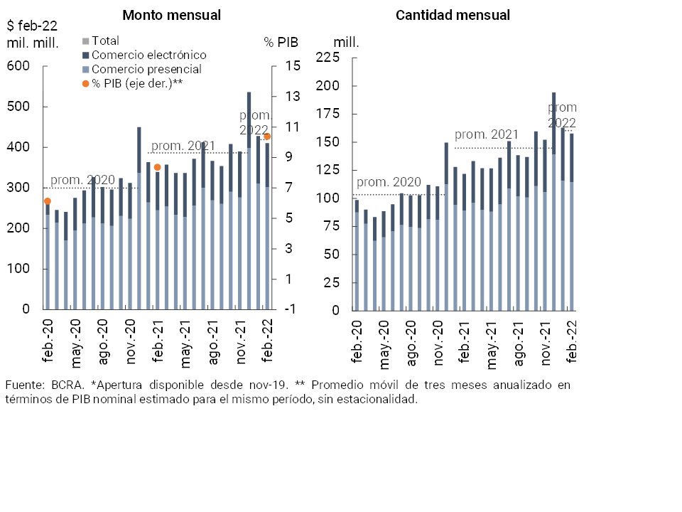 Durante febrero (última información disponible) disminuyeron las operaciones con tarjetas de débito -presenciales y electrónicas- respecto a enero (ver Gráfico 21), en parte recogiendo factores estacionales. No obstante, en términos interanuales las operaciones con tarjetas de débito crecieron significativamente (+29,5% en cantidades y +20,9% real en montos). Este comportamiento se reflejó tanto en las operaciones presenciales como electrónicas25. De esta manera, se estima que las operaciones mediante tarjeta de débito alcanzaron a representar un 10,4% del PIB (2 p.p. más que en igual mes del año anterior).