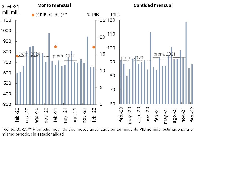 En febrero (última información disponible), las extracciones por cajero automático aumentaron respecto al mes anterior en cantidades (+3%) y en montos reales (+0,7%). En términos interanuales las extracciones por cajero automático se expandieron 4,8% en cantidades y disminuyeron 2,4% en montos reales. Se estima que a febrero el valor de las extracciones de efectivo vía cajero automático representó 17,1% del PIB26 (similar al registro del mismo mes del año anterior, ver Gráfico 22)27.