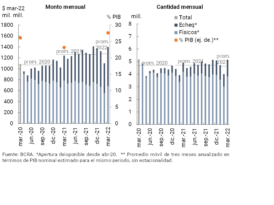 En marzo aumentó la compensación de cheques respecto al mes anterior (+28,4% en cantidades y +27,1% real en montos). Respecto al mismo mes del año anterior, la compensación de cheques acumuló un incremento de 5% en cantidades y 12,6% real en montos reales, aumento explicado en su totalidad por el formato electrónico (+87,1% en cantidades y +55,6% en montos reales). Así, durante marzo, los ECHEQs continuaron incrementando su ponderación en la compensación total, hasta representar 25,8% en cantidades (+11,3 p.p. i.a.) y 51% en montos reales (+14,1 p.p. i.a., ver Gráfico 23). Se estima que el monto de cheques compensados en términos del PIB totalizó 27,6% a marzo (+5,6 p.p. i.a.).