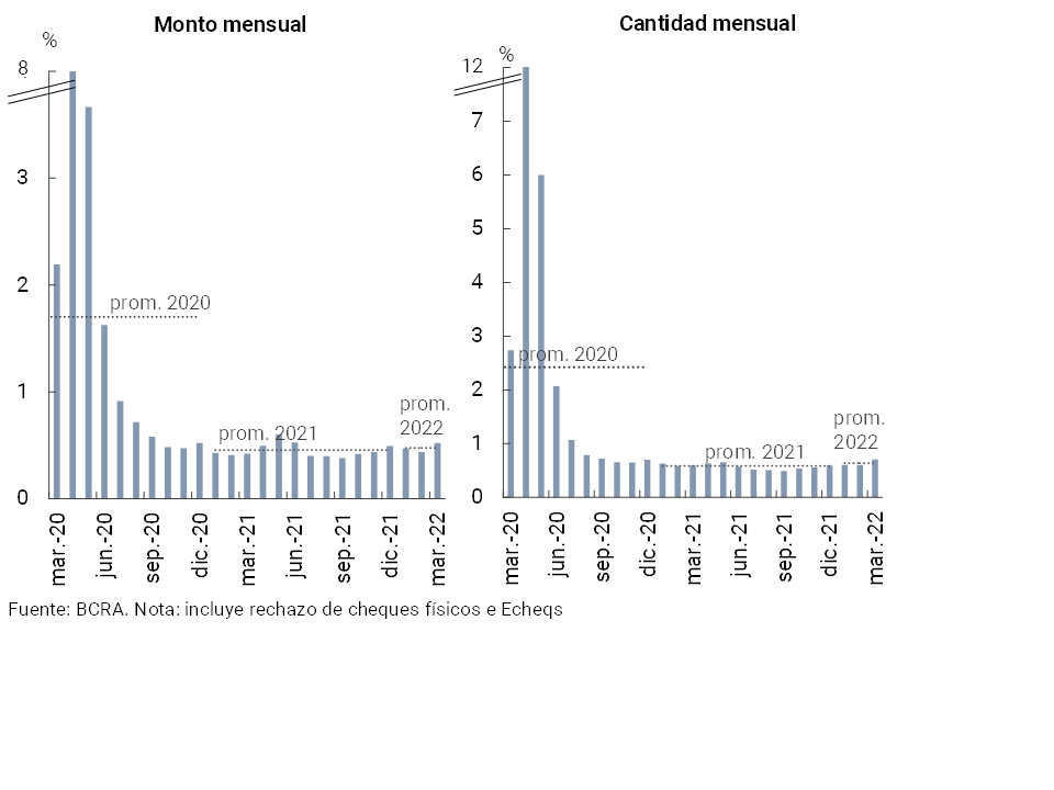 En marzo, el ratio de rechazo de cheques por falta de fondos en términos del total compensado28 se incrementó levemente con respecto a febrero (+0,11 p.p. hasta 0,7% en cantidades y +0,08 p.p. hasta 0,5% en montos, ver Gráfico 24).