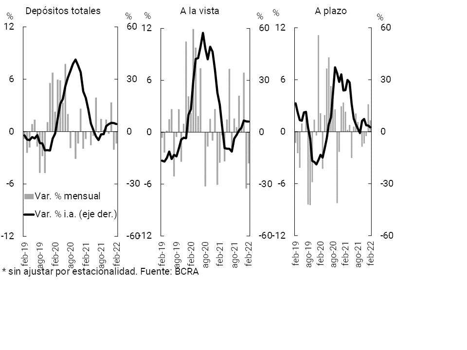 En términos interanuales, en febrero el saldo de depósitos en pesos del sector privado acumuló un incremento de 4,3% real (+58,8% nominal), con aumentos en las cuentas a la vista y en los depósitos a plazo. Por su parte, los depósitos del sector público en pesos se incrementaron 1,9% i.a. real en el período. Como resultado, el saldo de depósitos totales en pesos (considerando ambos sectores) creció 3,9% i.a. real. Teniendo en cuenta todas las monedas y sectores, el saldo de los depósitos totales se redujo 1% i.a. en términos reales.