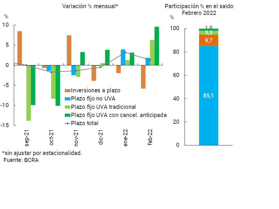 • El saldo de depósitos en pesos del sector privado se redujo 1,4% real con respecto a enero (+3,3% nominal), desempeño explicado principalmente por las cuentas a la vista. Los depósitos a plazo en pesos aumentaron 1,3% real en el mes (6,1% nominal), con un mayor dinamismo relativo en el segmento denominado en UVA. Este desempeño positivo recoge en parte el efecto de la suba de los límites mínimos de las tasas de interés sobre los plazos fijos dispuesta por el BCRA oportunamente. En una comparación interanual el saldo de depósitos en pesos del sector privado acumuló un incremento de 4,3% real (+58,8% nominal), con aumentos tanto en el segmento a la vista como a plazo.