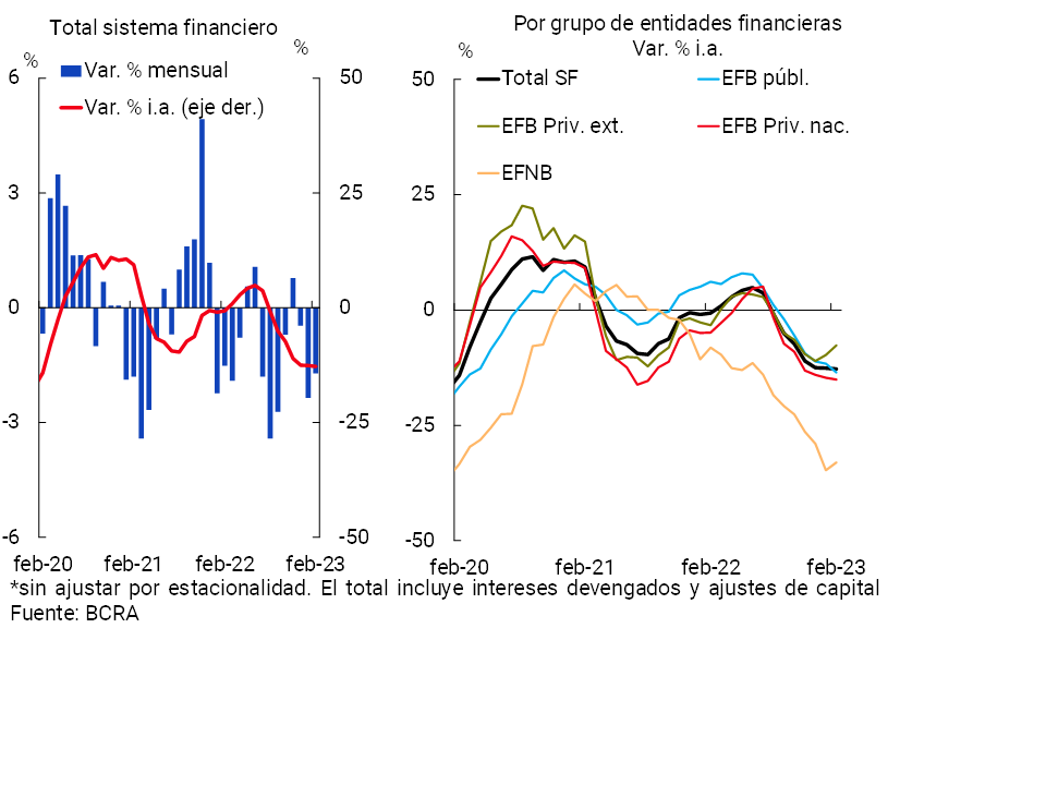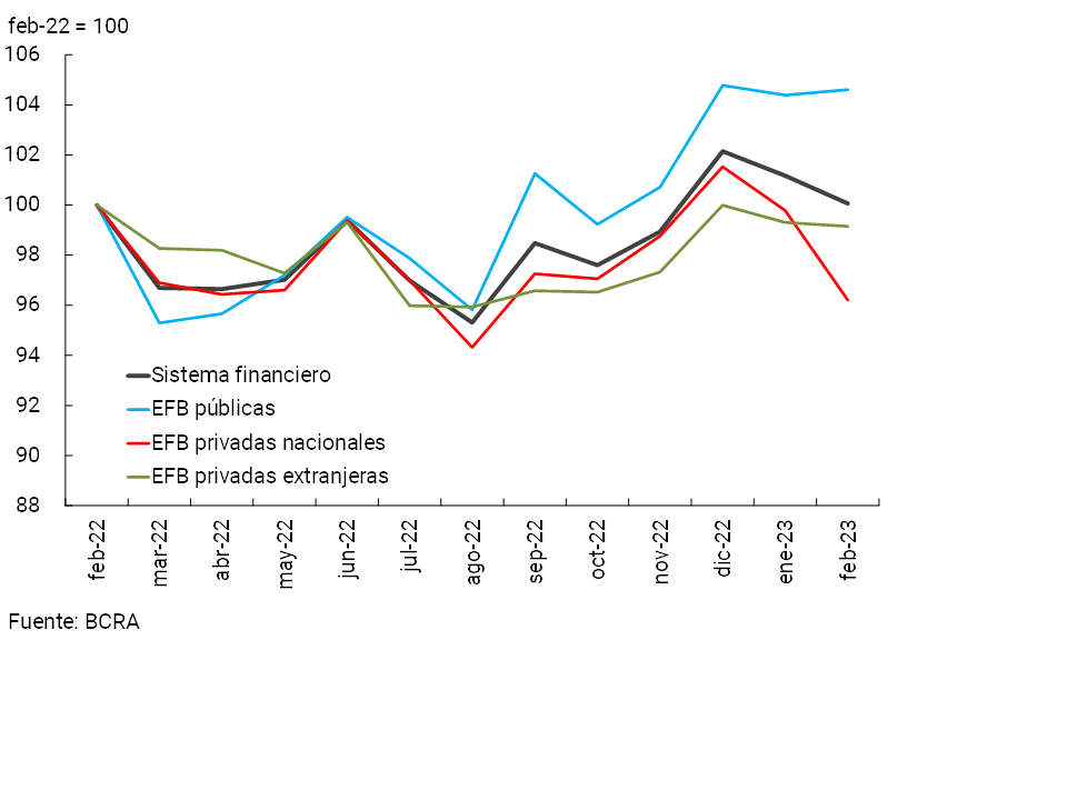 En febrero la actividad de intermediación financiera con el sector privado se redujo, recogiendo los efectos estacionales característicos de comienzos de año. En función de las variaciones más destacadas del balance agregado del conjunto entidades financieras para las partidas en pesos —en moneda homogénea—, en el mes disminuyó el saldo de crédito al sector privado y la liquidez en sentido amplio. Estos movimientos se produjeron simultáneamente con una reducción de los depósitos y un ligero incremento de las financiaciones del sector público en términos reales. Por el lado de las partidas en moneda extranjera, en febrero se redujo el saldo de crédito y la liquidez, variación que resultó principalmente compensada por una caída de los depósitos del sector público.