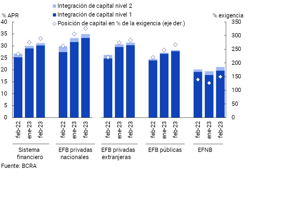 • Los indicadores de solvencia del sector aumentaron en el mes. La integración de capital regulatorio (RPC) del sistema financiero se ubicó en 31,1% de los activos ponderados por riesgo (APR), 1,1 p.p. por encima del registro de enero (+4,4 p.p. i.a.). La posición de capital —capital regulatorio neto del requisito normativo mínimo— totalizó 289,3% de la exigencia a nivel sistémico (+56,4 p.p. i.a.) y 46,4% del saldo de crédito al sector privado neto de previsiones.