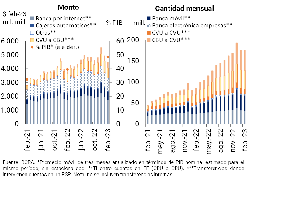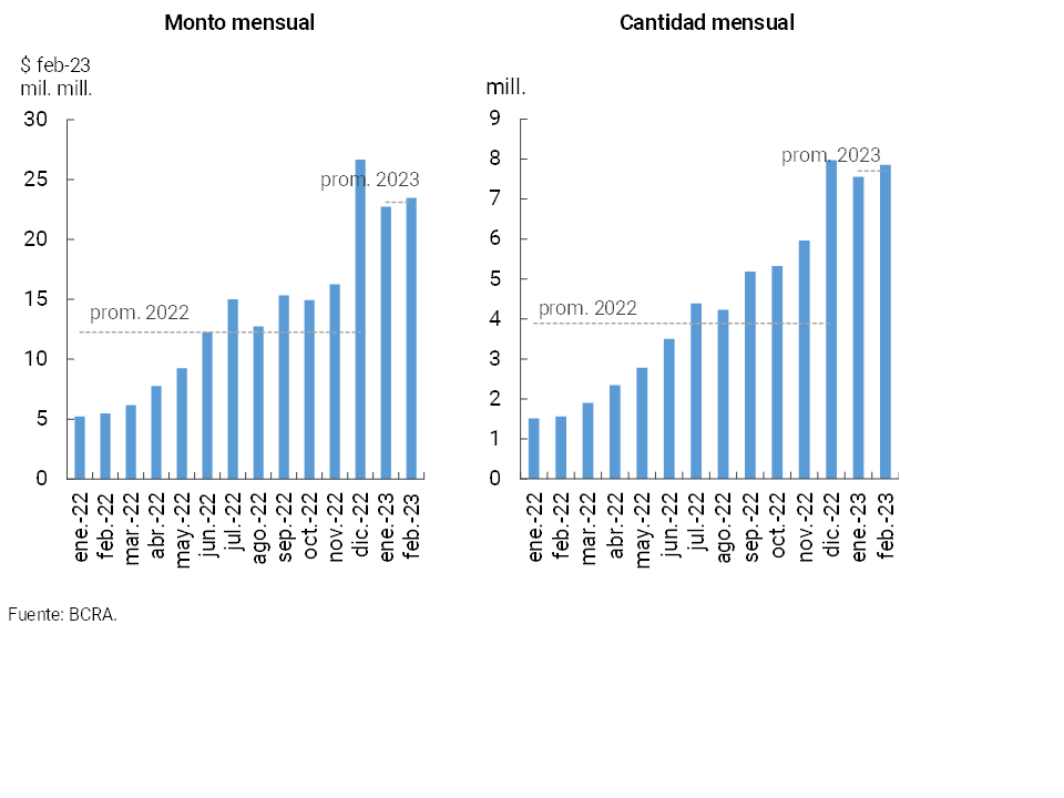 • Los medios de pago electrónico mantuvieron un importante dinamismo interanual en el comienzo de 2023. En febrero las transferencias inmediatas (TI) crecieron 60,2% i.a. en cantidades y 7,2% i.a. en montos reales. Los pagos con transferencia iniciados por medio de código QR interoperable también aumentaron, llegando prácticamente a quintuplicar la operatoria en una comparación interanual. Los ECHEQs siguieron incrementando su participación en la compensación de cheques, hasta explicar 35,1% de la cantidad y 60% del monto total en febrero.