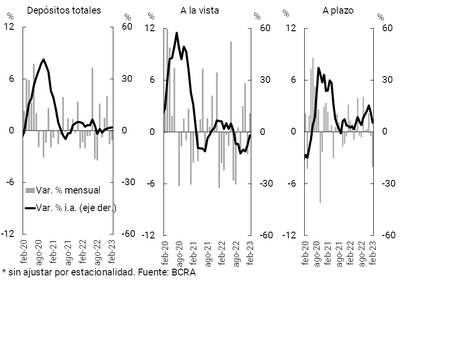 • El saldo de los depósitos en pesos del sector privado cayó 1,1% real en el mes (+1,9% i.a. real). Las cuentas a la vista aumentaron 2,2% real en febrero, mientras que el saldo de los depósitos a plazo se redujo 4% en términos reales. La dinámica de febrero estuvo en parte explicada por la migración de depósitos a plazo a cuentas a la vista remuneradas por parte de ciertos inversores institucionales, situación que se revirtió en marzo en el marco del aumento de las tasas de referencia y de los depósitos a plazo dispuesto por el BCRA.