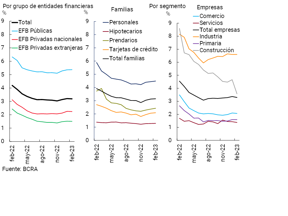El ratio de irregularidad del crédito al sector privado se mantuvo en 3,2% en febrero, reduciéndose 1 p.p. en términos interanuales (Ver Gráfico 8). Al distinguir por segmento de crédito, en el mes permaneció sin cambios el coeficiente de morosidad de los préstamos a las familias en 3,1% (-0,8 p.p. i.a.), mientras que el indicador de mora de los créditos a las empresas disminuyó levemente en el período hasta 3,3% (-1,3 p.p. i.a.).