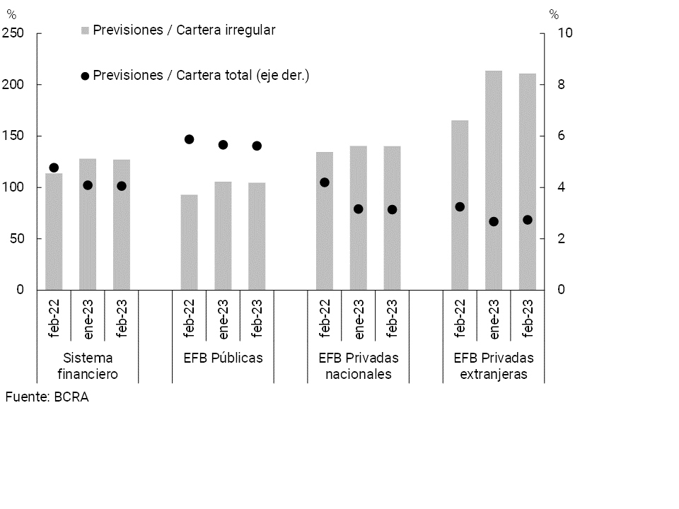 • En febrero el ratio de irregularidad del crédito al sector privado se mantuvo en 3,2% (-1 p.p. en términos interanuales). El coeficiente de morosidad de los préstamos a las familias se ubicó en 3,1% en el período, mientras que el indicador para los créditos a las empresas totalizó 3,3%. En el mes las previsiones por incobrabilidad del sistema financiero se mantuvieron relativamente altas, representando 4,1% del crédito total al sector privado y 127,2% de la cartera en situación irregular.