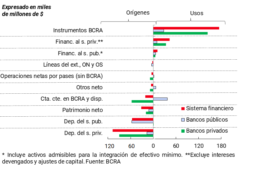 En una comparación interanual, los depósitos del sector privado en pesos disminuyeron 2% en términos reales, con un incremento en los concertados a plazo (+11,4% i.a. real) y una reducción en las cuentas a la vista (-13,1% i.a. real). Los depósitos del sector público también cayeron en los últimos 12 meses. En este marco, el saldo de depósitos totales disminuyó 6,3% i.a. real.