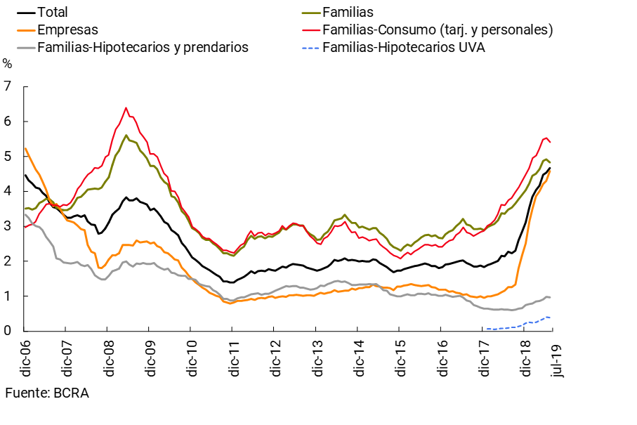 • El ratio de morosidad del crédito total al sector privado se situó en 4,7% en julio, aumentando 0,1 p.p. en el mes (+2,4 p.p. i.a.). La irregularidad de los préstamos a las empresas se incrementó 0,3 p.p. en el período (+3,3 p.p. i.a.) hasta representar 4,6% de esta cartera, mientras que el coeficiente de mora de los préstamos a las familias disminuyó 0,1 p.p. (+1,3 p.p. i.a.), hasta situarse en 4,8%. Los créditos hipotecarios a las familias mantuvieron sin cambios su ratio de morosidad en el mes: 0,4% para el segmento denominado en UVA y 0,7% para el resto. El saldo estimado de previsiones contables atribuible a la cartera en situación irregular representó 76% de esta última (98% considerando el saldo total de previsiones). Por su parte, se estima que las financiaciones en situación irregular no cubiertas con previsiones se ubicaron en 4,3% del saldo de la integración de capital regulatorio (8,9% del exceso de capital regulatorio), reduciéndose 0,4 p.p. respecto del valor del mes junio.