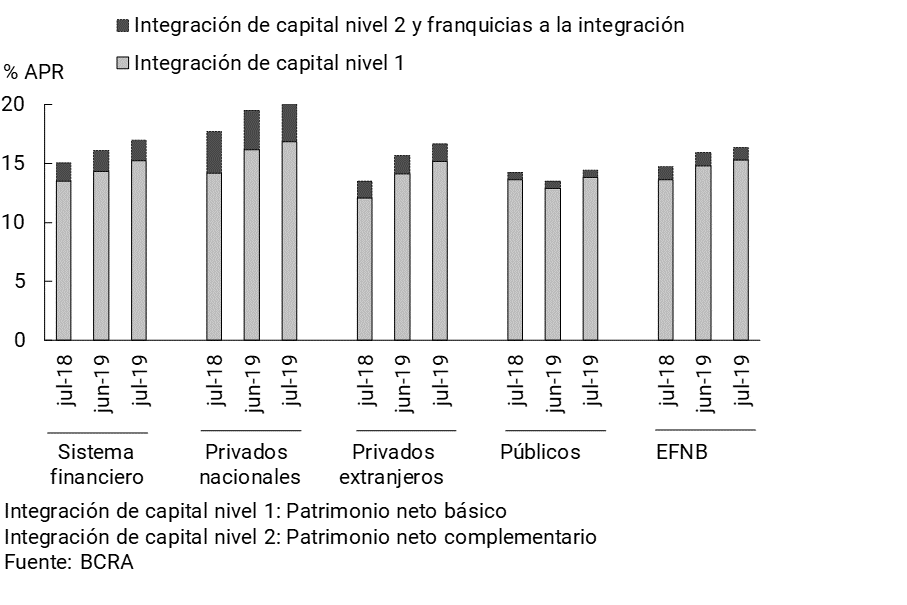 • Los ratios de solvencia para el conjunto de bancos se incrementaron en julio. La integración de capital —Responsabilidad Patrimonial Computable o RPC— alcanzó 17% de los activos ponderados por riesgo —APR—, aumentando 0,9 p.p. con respecto a junio y 1,9 p.p. interanual (i.a.). El cociente entre la RPC y la exigencia de capital mínima totalizó 192%, 7,3 p.p. más que en junio y 16,8 p.p. i.a. Por su parte, el coeficiente de apalancamiento del sistema financiero (capital regulatorio nivel 1 en términos de una medida amplia de exposiciones —dentro y fuera de balance—) alcanzó 8,7% a junio —última información disponible—, por encima del mínimo local de 3% (según el estándar internacional recomendado por el Comité de Basilea).