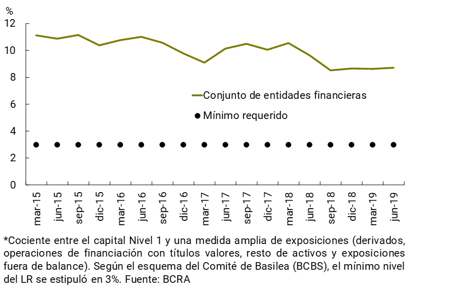 El coeficiente de apalancamiento (capital nivel 1 como porcentaje de una medida amplia de exposiciones que asumen los bancos, tanto dentro como fuera de balance) superó holgadamente los requisitos mínimos locales. Dichos requisitos están en línea con las recomendaciones internacionales (según el Comité de Basilea). El sistema financiero exhibió un apalancamiento de 8,7% a junio —última información disponible—, por encima del mínimo regulatorio de 3% (ver Gráfico 13).